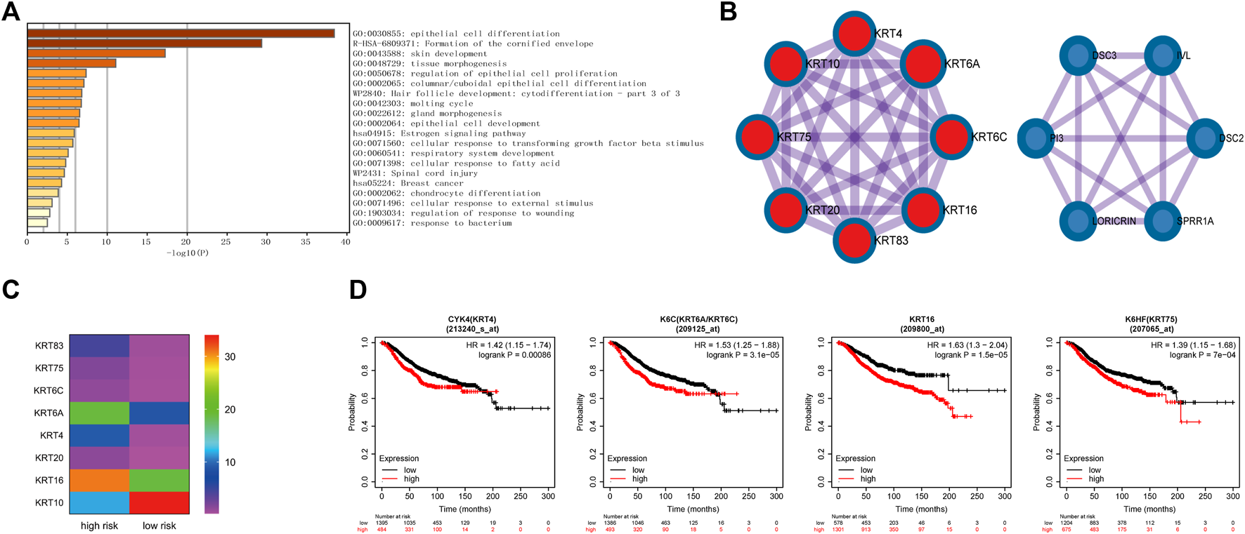 Identification of the formation of cornified envelope pathway involved in the differentially expressed genes between high- and low-risk groups. (A). The enrichment pathways of genes involved in the formation of the cornified envelope pathway. (B). The genes of two main MCODE modules analyzed by Cytoscape. (C). The expression levels of genes in keratin-related MCODE module between the high- and low-risk groups. (D). Kaplan–Meier curves of overall survival of some genes in keratin-related MCODE module for breast cancer patients in Kaplan-Meier Plotter database.