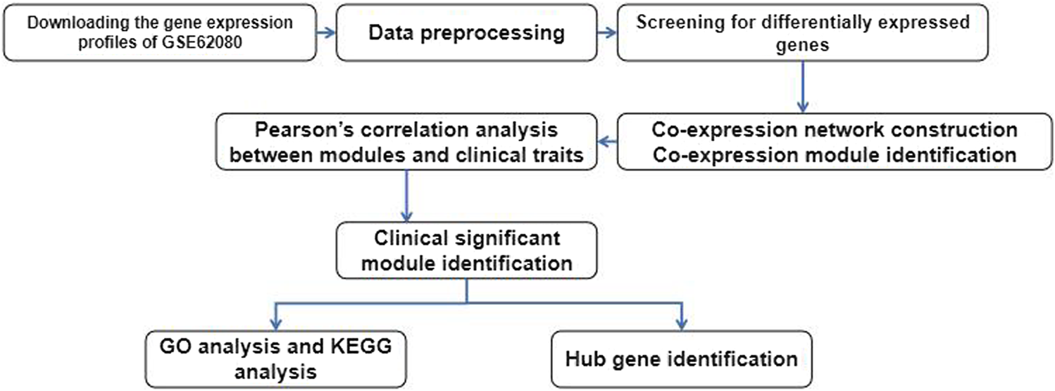 Figure 1 reveals the process of our study. We downloaded the gene expression profiles of GSE62080, which were based on the GPL570 platform (Affymetrix Human Genome U133 Plus 2.0 Array) from the Gene Expression Omnibus (GEO) database (https://www.ncbi.nlm.nih.gov/geo/query/acc.cgi?acc=gse62080). We chose GSE62080 because this expression profile data include 21 samples from patients with advanced colorectal cancer, and all patients had received chemotherapy based on the FOLFIRI regimen. We used the robust multiple-array average (RMA) algorithm in the affy package of the Bioconductor in R to preprocess the gene expression profile data. We got the gene expression profile dataset containing 23,519 genes after background correction, quantile normalization, and probe aggregation. Then, 10,825 genes which were the top 50% most variant genes by analysis of variance were screened for further analysis.