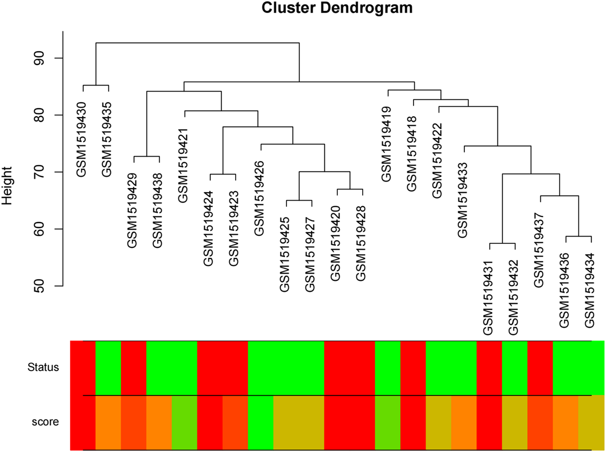 We obtained the expression profile data which contained 21 samples and 21,648 genes. The variance of each gene in each sample was calculated, and the top 50% of genes with a small variance were eliminated. We analyzed and clustered the samples of GSE62080 based on the average linkage method and the Pearson correlation method. Figure 2 portrays the clustering results with sample characteristics. The status was divided into R (change in indicator lesion size<−50%) and NR (change in indicator lesion size ≥ −50% or progression of disease). The scores were defined as follows: 5: change in indicator lesion size<−75%; 4: −75% ≤ change in indicator lesion size<−50%; 3: −50% ≤ change in indicator lesion size<−25%; 2: −25% ≤ change in indicator lesion size<0%; 1: change in indicator lesion size = 0%; and 0: progression of disease. We adopted the power of β = 7 as the soft-thresholding parameter to ensure a scale-free network (Figure 3). Then, we set the minimum size of the gene group to be 100 for the gene dendrogram and conducted the average linkage hierarchical clustering based on the TOM-based dissimilarity measure. The ME of each module was calculated, and 19 modules were identified (Figure 4).