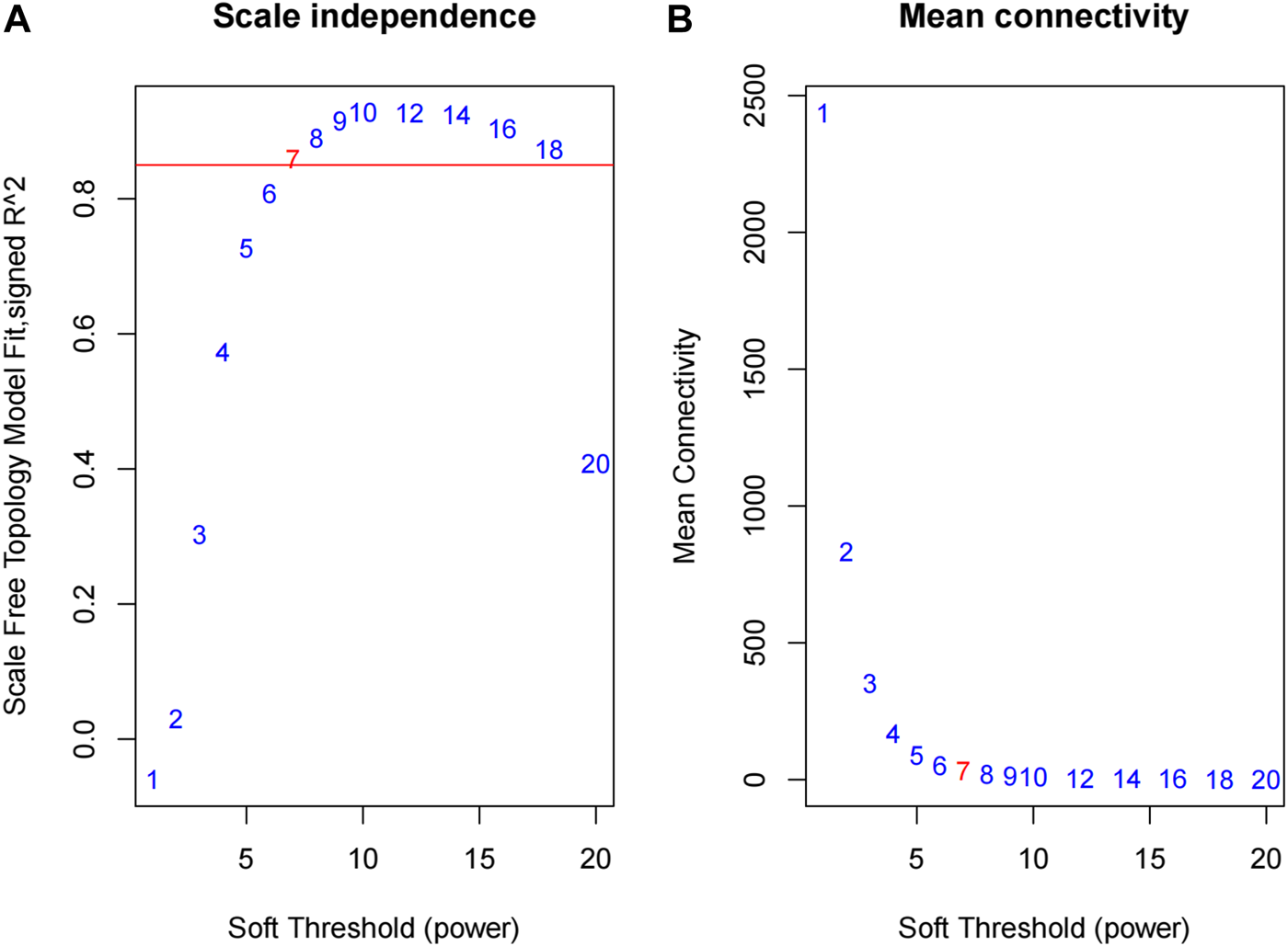 Determination of the soft-thresholding power in the WGCNA. (A) Analysis of the scale-free fit index for various soft-thresholding powers (β). (B) Analysis of the mean connectivity for various soft-thresholding powers.