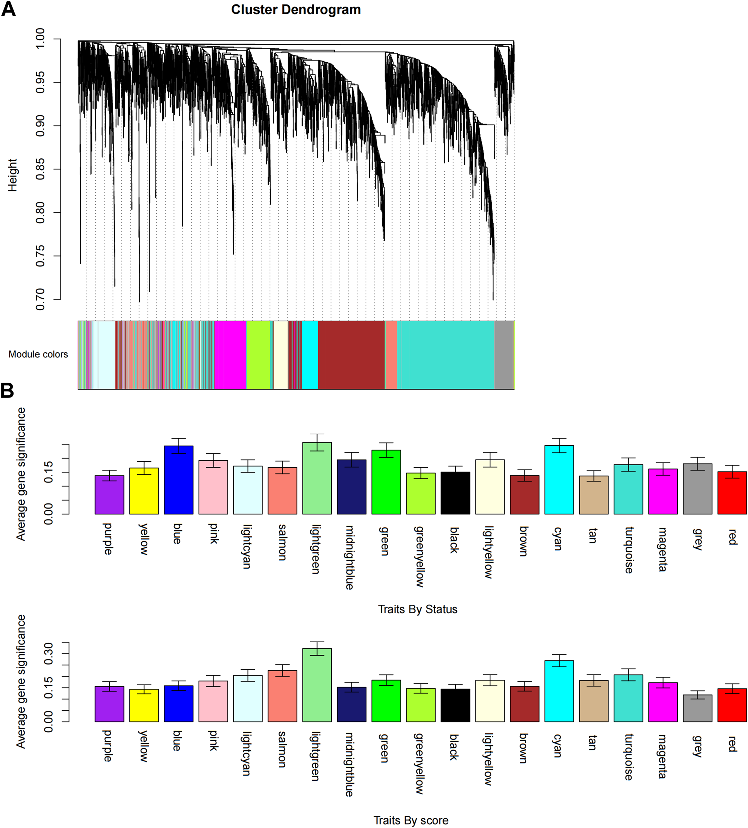 Identification of modules associated with the FOLFIRI response of colon cancer. (A) Dendrogram of all differentially expressed gene clusters based on a dissimilarity measure (1-TOM). (B) Distribution of the average gene significance and errors in the modules associated with status and scores of colon cancer.