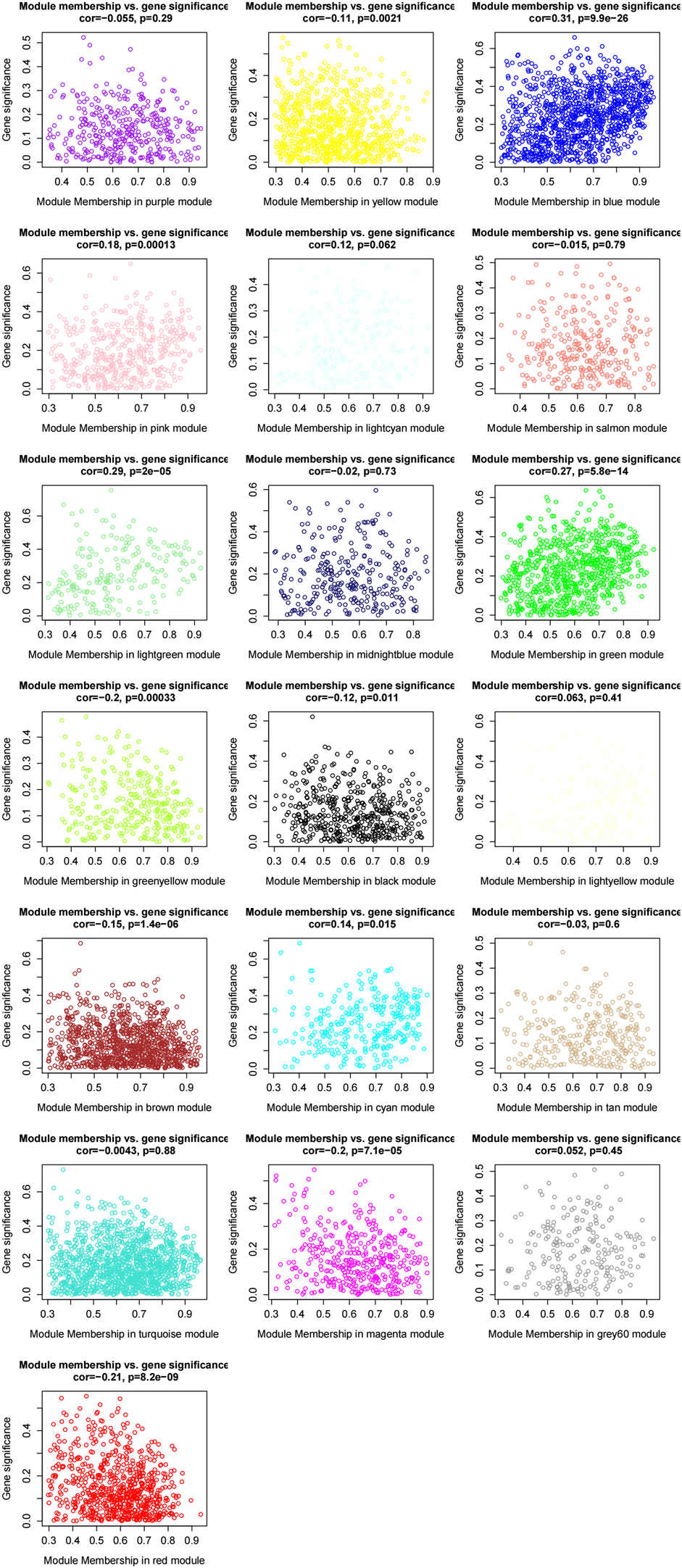 In this formula, q is the gene module. Then, we used the Pearson correlation between the expression profile of a certain gene in all samples and the expression profile of a certain ME to measure the module membership (MM) of this gene in the module. MM is calculated as follows:Here, represents the ME of the module q; represents the MM of the gene i in module q. In addition, the gene significance (GS) was defined as the mediated p-value of each gene in the linear regression between gene expression and clinical characteristics. GS was used to measure the degree of association between genes and clinical characteristics. Moreover, we define the module significance (MS) as the average GS of all genes involved in the module.