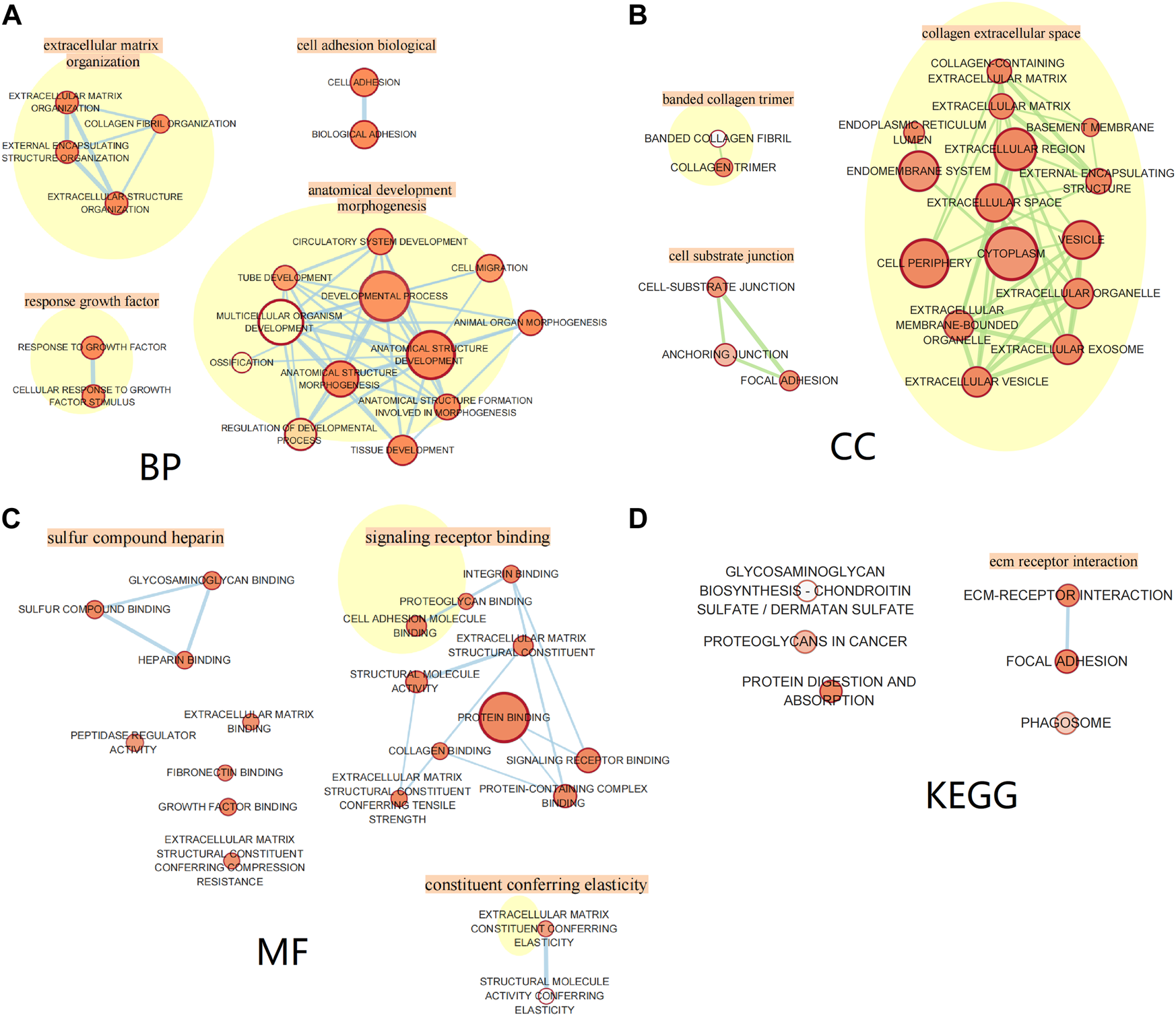 All genes in the blue module were divided into the biological process (BP) group, cellular component (CC) group, and molecular function (MF) group. We used Cytoscape (vision 3.8.2) analysis and screened out the top 20 functions of enriched genes in the BP, CC, and MF groups, respectively, and used the EnrichmentMap in Cytoscape for visualization of enrichment results. The genes in the BP group were mainly enriched in extracellular matrix organization, cell adhesion, growth factor response, and anatomical development morphogenesis. The genes in the CC group were mainly enriched in functions associated with collagen extracellular space, banded collagen trimer, and cell substrate junction. The genes in the MF group were mainly enriched in sulfur compound heparin, signaling receptor binding, and constituent conferring elasticity. Moreover, through Kyoto Encyclopedia of Genes and Genomes (KEGG) pathway analysis, we found that significant genes were mainly related to ECM–receptor interaction, glycosaminoglycan biosynthesis—chondroitin sulfate/dermatan sulfate, proteoglycans in cancer, protein digestion, and absorption. The results are shown in Figure 8.
