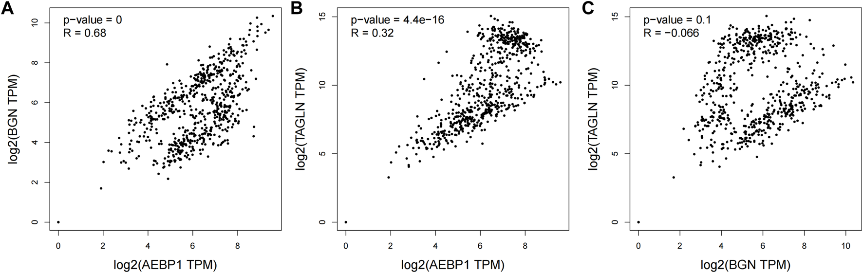We set the cut-off criteria as |MM| > 0.9 and |GS| > 0.2 and selected 50 hub genes with high connectivity in the blue module. Using STRING, we further performed protein–protein interaction (PPI) analysis on these 50 genes and then used MCODE in Cytoscope for further data screening and visualization. Finally, 13 key node genes (COL18A1, TIMP2, DCN, LTBP1, FBN1, TAGLN, EFEMP2, LUM, CDH11, ACTA2, BGN, COL6A2, and AEBP1) were screened out (Figure 9). We further explored the association of the expression levels of the aforementioned genes on overall survival (OS) and disease-free survival (DFS) in colon cancer patients in the GEPIA database. The results showed that the high levels of AEBP1, BGN, EFEMP2, and TAGLN expressions were associated with a shorter OS, and over-expression of AEBP1, BGN, CDH11, COL18A1, LUM, TAGLN, and TIMP2 were negatively associated with DFS (Figure 10). We selected three genes (AEBP1, BGN, and TAGLN) that were negatively related to both OS and DFS for further exploration. A significant correlation between AEBP1 and BGN expressions was found. In addition, AEBP1 and TAGLN expressions also showed a significant correlation. However, the correlation between BGN and TAGLN expressions was not statistically significant (Figure 11). According to the Human Protein Atlas database, we found that the protein expression levels of AEBP1, BGN, and TAGLN in tumor tissues were higher than those in normal tissues (Figure 12).