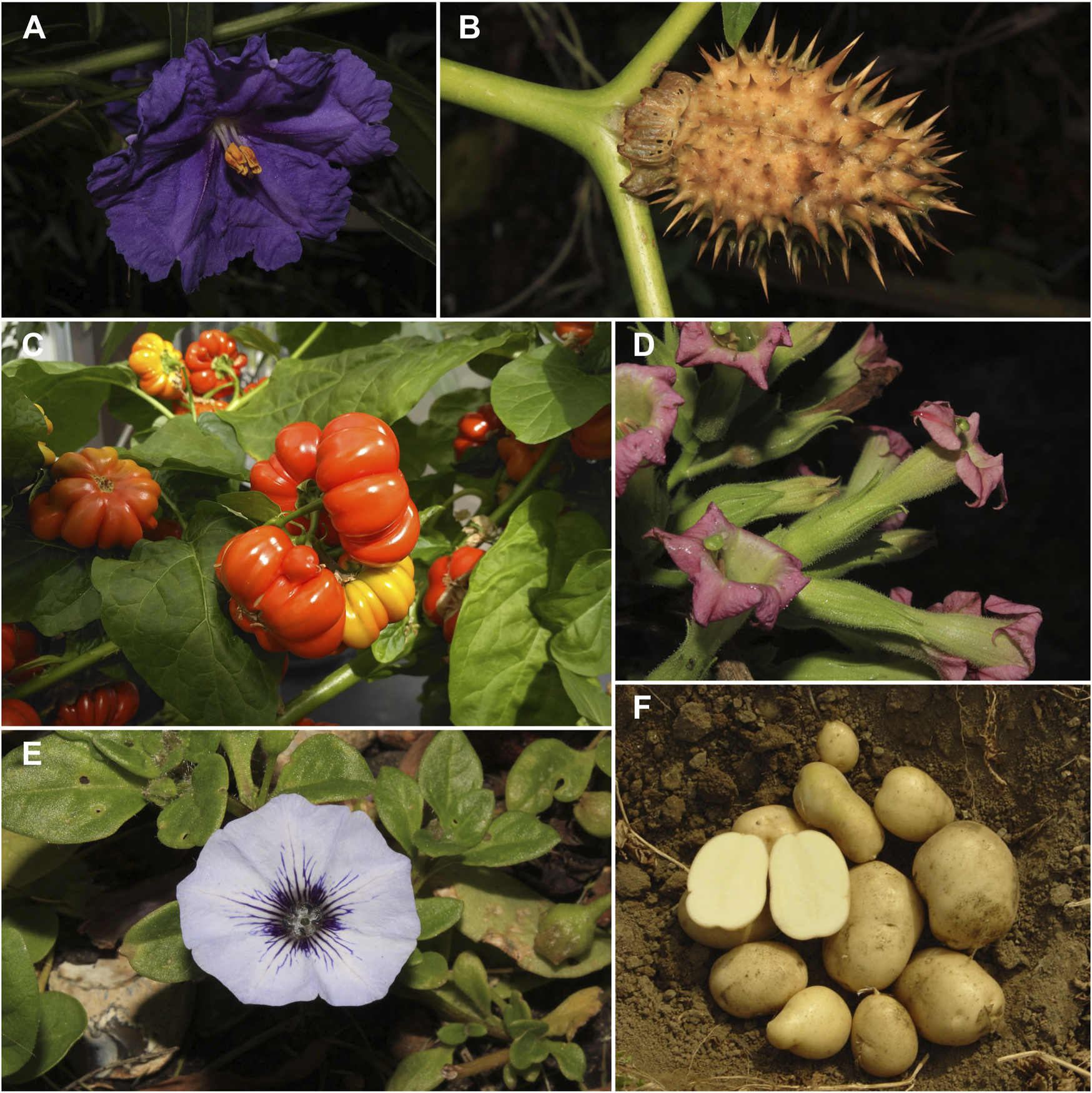 Diversity of Solanaceae crops, poisonous weeds, and relatives. (A)Solanum laciniatum Aiton, (B)Datura stramonium L., (C)Solanum lycopersicum L., (D)Nicotiana tabacum L., (E)Nolana humifusa (Gouan) I.M.Johnst., (F)Solanum tuberosum L. A-B, D-E photographs by R. Deanna at Chelsea Physics Garden; C by P. Poczai; F by D. Carputo.