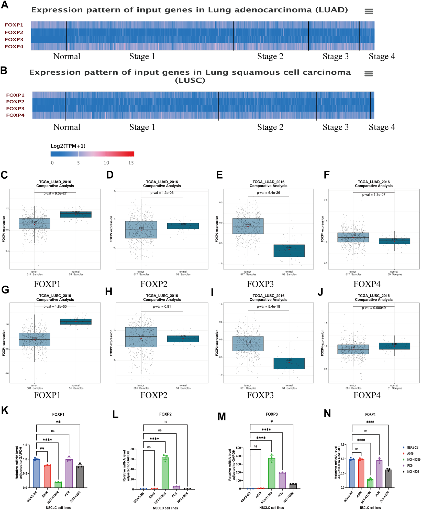 The differential expression of FOXP family in NSCLC. (A) The heatmap represented the transcriptional levels of FOXP family in patients with LUAD compared with normal samples using UALCAN. (B) The heatmap represented the transcriptional levels of FOXP family in patients with LUSC compared with normal samples using UALCAN. (C–J) The compare the mRNA expression of FOXP1/2/3/4 between LUAD/LUSC and normal tissue samples by using GEPIA dataset; The box plot showed the relative expression levels of family in normal tissue and NSCLC tissue. p < 0.05 was defined as statistically significant. (K–N) The mRNA levels of FOXP family between LUAD cell lines (A549, NCI-H1299, and PC9)/LUSC cell line (NCI-H226) and normal human lung epithelial cell line (BEAS-2B) by RT-qPCR. (Legend: ***p ≤ 0.001; **p ≤ 0.01; *p ≤ 0.05; ns. p > 0.05; LUAD, Lung adenocarcinoma; LUSC, Squamous cell carcinoma of lung; FOXP, Forkhead box P; RT-qPCR, Reverse transcription-quantitative polymerase chain reaction).