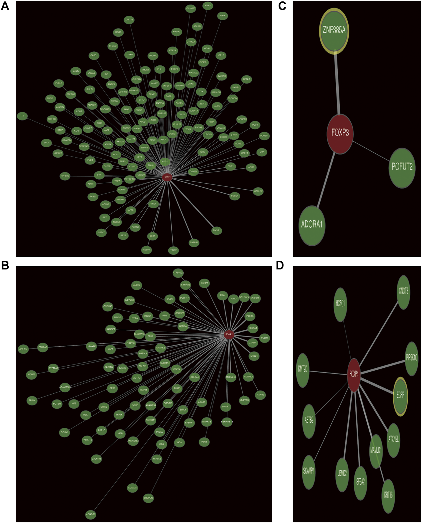 The coexpression network of FOXP family. (A) The coexpression network presented the coexpressed genes of FOXP1. (B) The coexpression network presented the coexpressed genes of FOXP2. (C) The coexpression network presented the coexpressed genes of FOXP3. (D) The coexpression network presented the coexpressed genes of FOXP4.