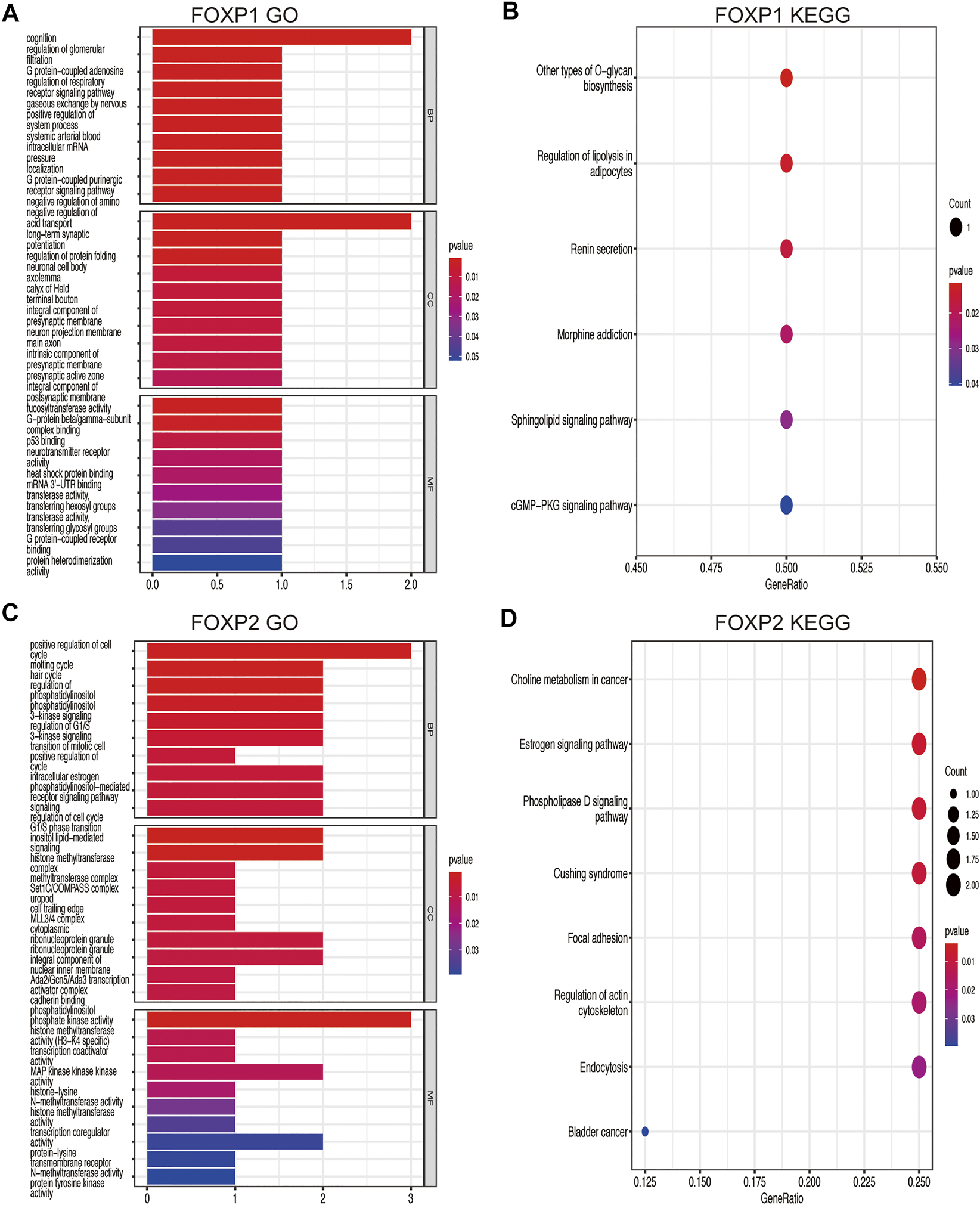 GO functional and KEGG pathway enrichment analyses were performed on the coexpressed genes. (A) The GO functional enrichment analysis result on the coexpressed genes of FOXP1 using three annotation systems (BP; CC; MF). (B) The KEGG pathway enrichment analysis result on the coexpressed genes of FOXP1. (C) The GO functional enrichment analysis result on the coexpressed genes of FOXP2. (D) The KEGG pathway enrichment analysis result on the coexpressed genes of FOXP2. (BP, Biological process; MF, Molecular function; CC, Cellular component).