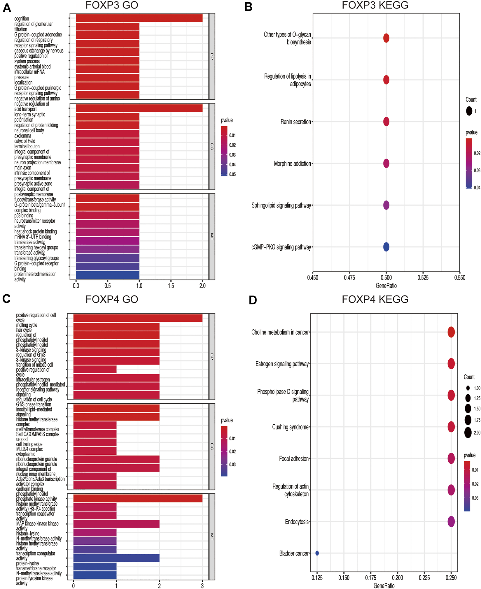 GO functional enrichment analysis and KEGG pathway enrichment analysis are performed on the coexpressed genes. (A) The result of GO functional enrichment analysis on the coexpressed genes of FOXP3. (B) The result of KEGG pathway enrichment analysis on the coexpressed genes of FOXP3. (C) The result of GO functional enrichment analysis on the coexpressed genes of FOXP4. (D) The result of KEGG pathway enrichment analysis on the coexpressed genes of FOXP4.