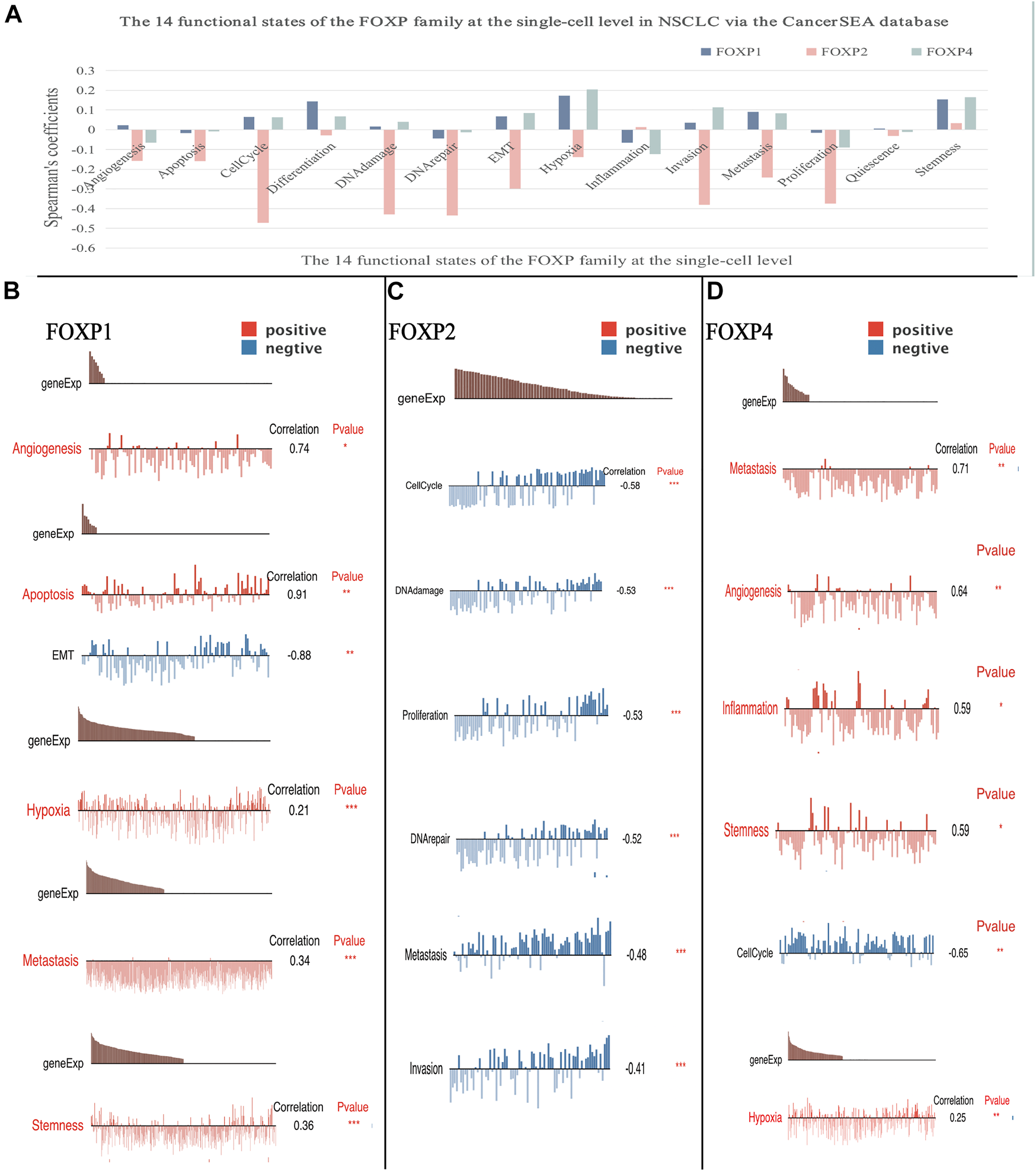 The correlation between the FOXP family and 14 functional states at single-cell level. (A) The result of the correlation between expression of the FOXP1/2/4 with functional states (including angiogenesis, apoptosis, invasion, EMT, differentiation, proliferation, DNA damage, metastasis, hypoxia, inflammation, cell cycle, DNA repair, stemness, and quiescence). (B) The sample Kim (Exp0068) showed the result of the correlation between the FOXP1 with functional states. (C) The sample Kim (Exp0066) showed the result of the correlation between the FOXP2 with functional states. (D) The sample Kim (Exp0068) showed the result of the correlation between the FOXP4 with functional states. (EMT, epithelial-mesenchymal transition).