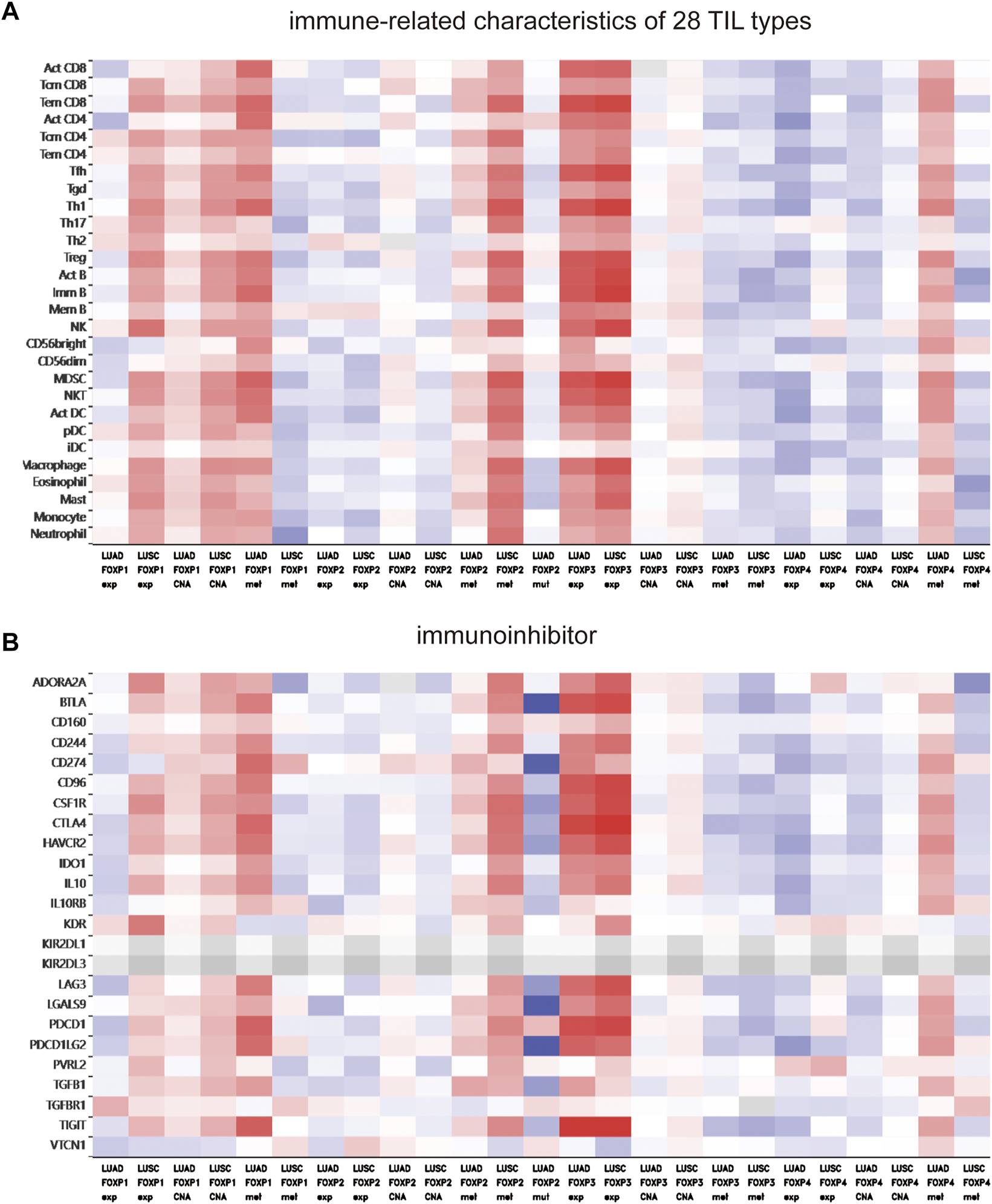 The relationship between the degree of immune factors infiltration in NSCLC and the expression of FOXP family. (A) The hotmap presented the correlations between the FOXP family and immune-related characteristics of 28 TIL types. (B) The hotmap presents the correlations between the FOXP family and immunoinhibitor.