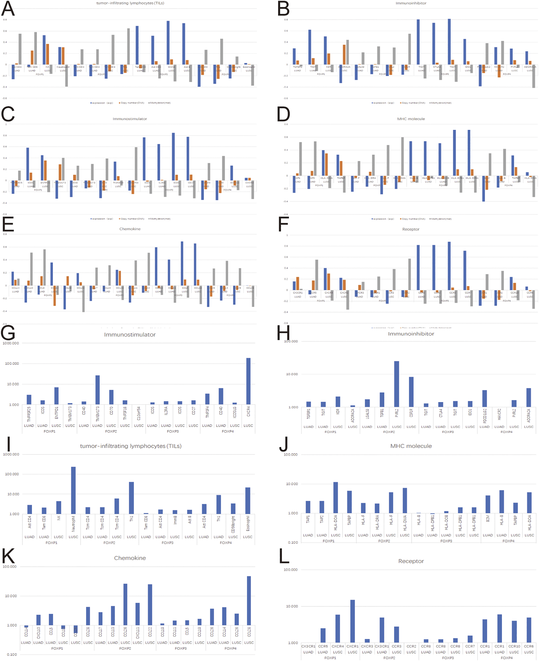 The effects of FOXP family expression, copy number alteration, and DNA methylation on immune factors. (A–F) These histograms present the correlation scores of the top two most relevant immune infiltration module and correlation scores modified by copy number alteration and DNA methylation. (G–L) These histograms present the fold relationship between copy number alteration and DNA methylation correlation scores of the FOXP family in NSCLC. (CNA, Copy number alteration; MET, DNA Methylation).