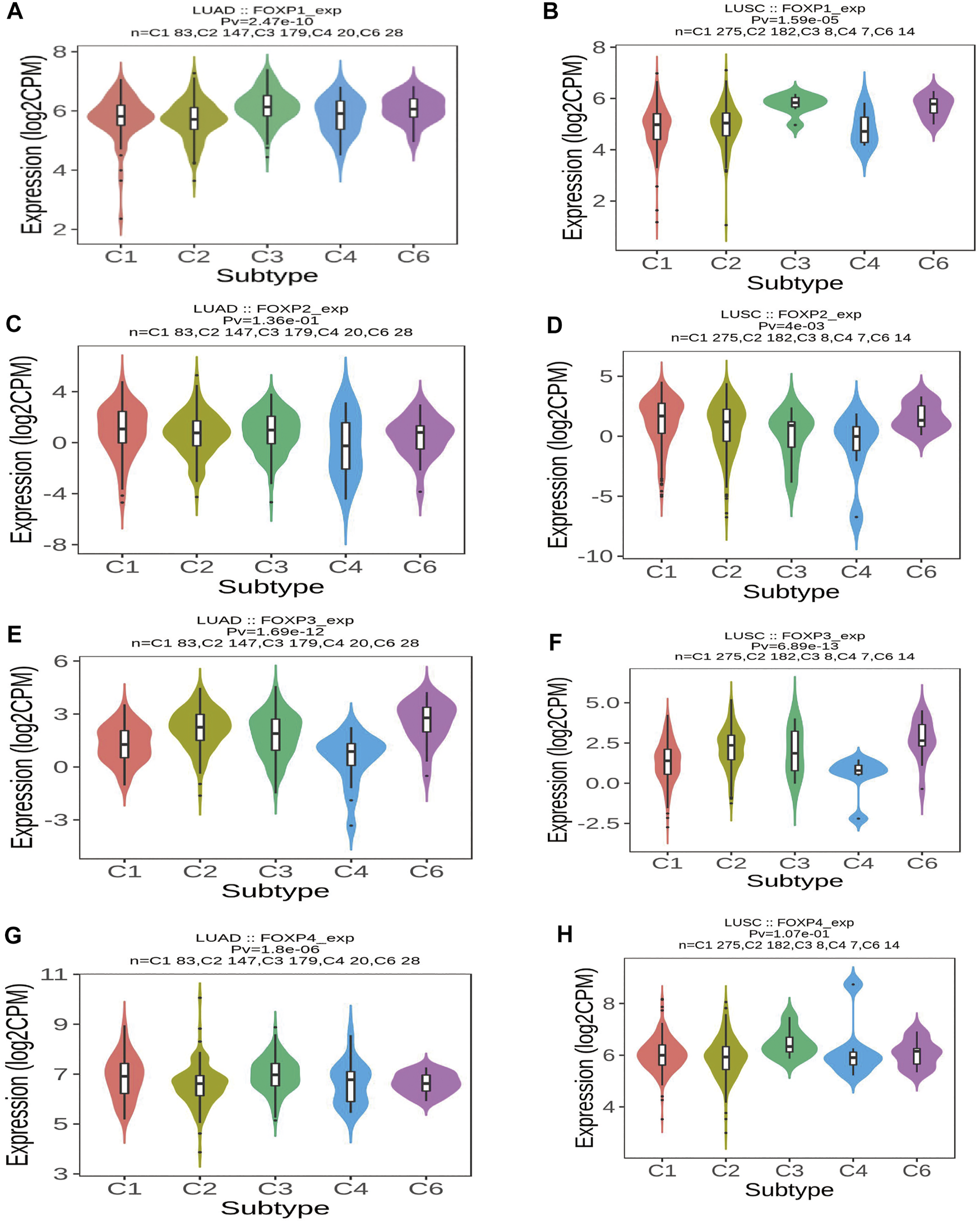 The relationship between immune types and the FOXP family. (A) The violins plot showed statistical relationships between FOXP1 and immune types C1–C6 in LUAD. (B) The violins plot showed statistical relationships between FOXP1 and immune types C1–C6 in LUSC. (C) The violins plot showed statistical relationships between FOXP2 and immune types C1–C6 in LUAD. (D) The violins plot showed statistical relationships between FOXP2 and immune types C1–C6 in LUSC. (E) The violins plot showed statistical relationships between FOXP3 and immune types C1–C6 in LUAD. (F) The violins plot showed statistical relationships between FOXP3 and immune types C1–C6 in LUSC. (G) The violins plot showed statistical relationships between FOXP4 and immune types C1–C6 in LUAD. (H) The violins plot showed statistical relationships between FOXP4 and immune types C1–C6 in LUSC. [C1 (wound healing); C2 (IFN-gamma dominant); C3 (inflammatory); C4 (lymphocyte depleted); C5 (immunologically quiet); C6 (TGF-b dominant)].