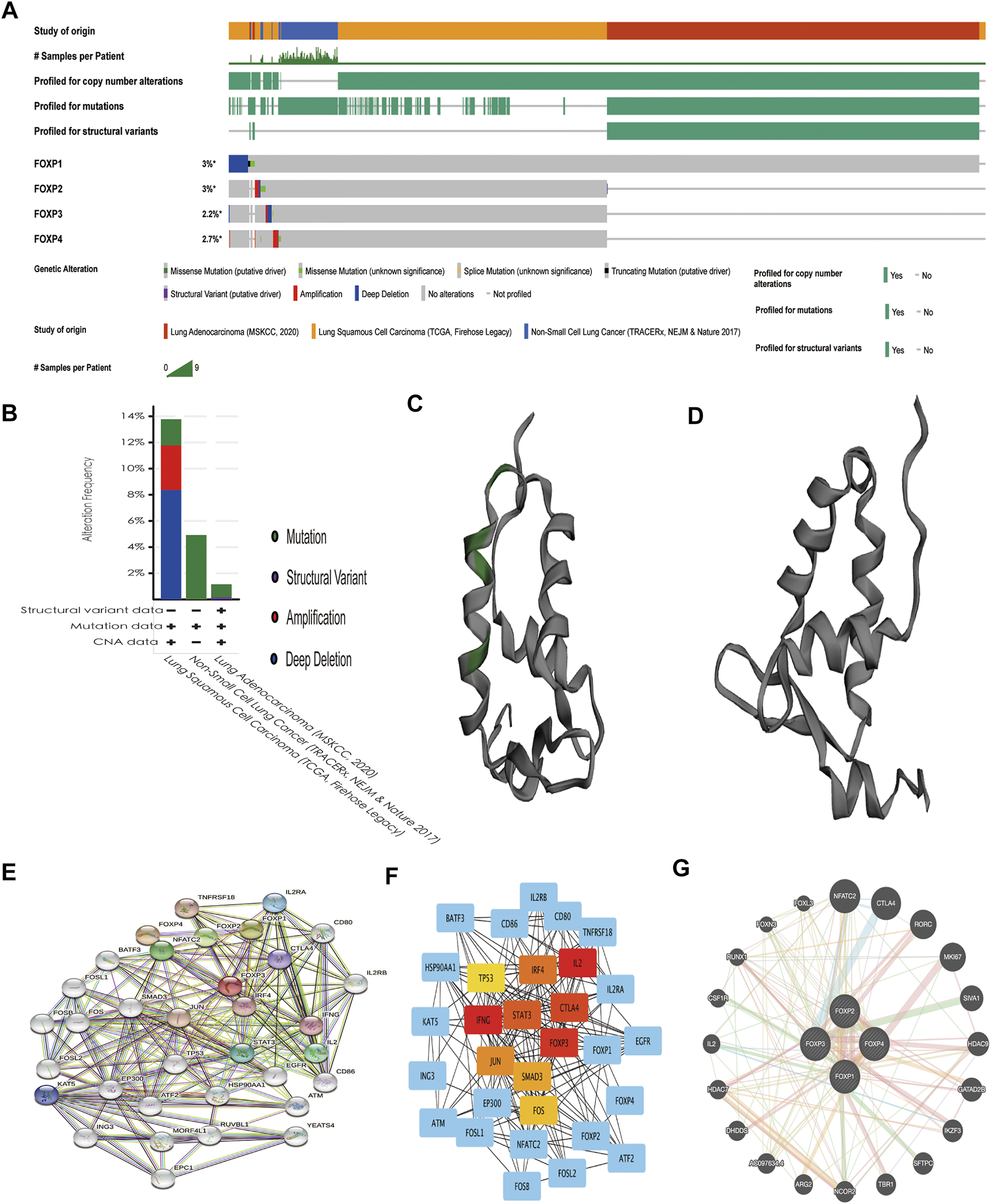 Upon analysis of the FOXP family in the OncoPrint module on cBioPortal, the results revealed that gene alterations in FOXP1/2/3/4 occurred in 3%, 3%, 2.2%, and 2.7% of the NSCLC samples, respectively (Figure 13A). The genetic alterations of structural variants, mutations, amplifications, deep deletions, and copy number alterations of the FOXP family all occurred in NSCLC (Figure 13B). The details of all mutations in NSCLC are summarized in Supplement Figure 6. FOXP1 had 15 missense mutations, 3 splice mutations, and one fusion mutation. FOXP2 had one missense mutation and one Fusion mutation. FOXP3 had one missense mutation. FOXP4 had no mutation. Only FOXP1 had domain mutations (Figure 13C), while the remaining FOXP2/3/4 had no domain mutations (Figure 13D). The abovementioned multiple alterations of the FOXP family might partially explain the mechanism of occurrence and progression in NSCLC. In addition, we conducted a PPI network analysis of the FOXP family by STRING to investigate the feasible interactions in their internal and related genes. Multiple nodes (34) and edges (212) are shown in the PPI network (Figure 13E). The STRING results mainly displayed the functions connected with immunity, including regulation of T cell homeostatic proliferation, the activity of T-helper 17 cells, the signalling pathway mediated by interleukin-2, and the adjustment of regulatory T cell differentiation. We further investigated the results of STRING in Cytoscape and then curtained and locked out 10 hub genes (IL2, IFNG, FOXP3, CTLA4, STAT3, IRF4, JUN, SMAD3, FOS, TP53), as shown in Figure 13F. The FOXP family was input to the GeneMANIA website to link genes with similar functions. Functionally similar genes surrounded the outside of the FOXP family in the presentation (Figure 13G). The GeneMANIA results affirmed that the functions of the FOXP family and their related clusters were chiefly related to the differentiation of lymphocytes and T cells and the regulation of leukocytes. The above results support that the FOXP family participates in the immune process of NSCLC under the condition of interaction.