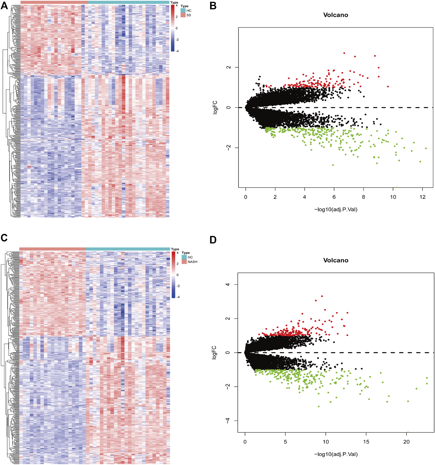 DEGs screening for HC-SS and HC-NASH. In heatmap, red color indicates up-regulation while blue color indicates down-regulation. In volcano plot, red dots represent up-regulated genes while green dots represent down-regulated genes. (A,B) Heatmap and volcano plot for HC-SS. (C,D) Heatmap and volcano plot for HC-NASH.