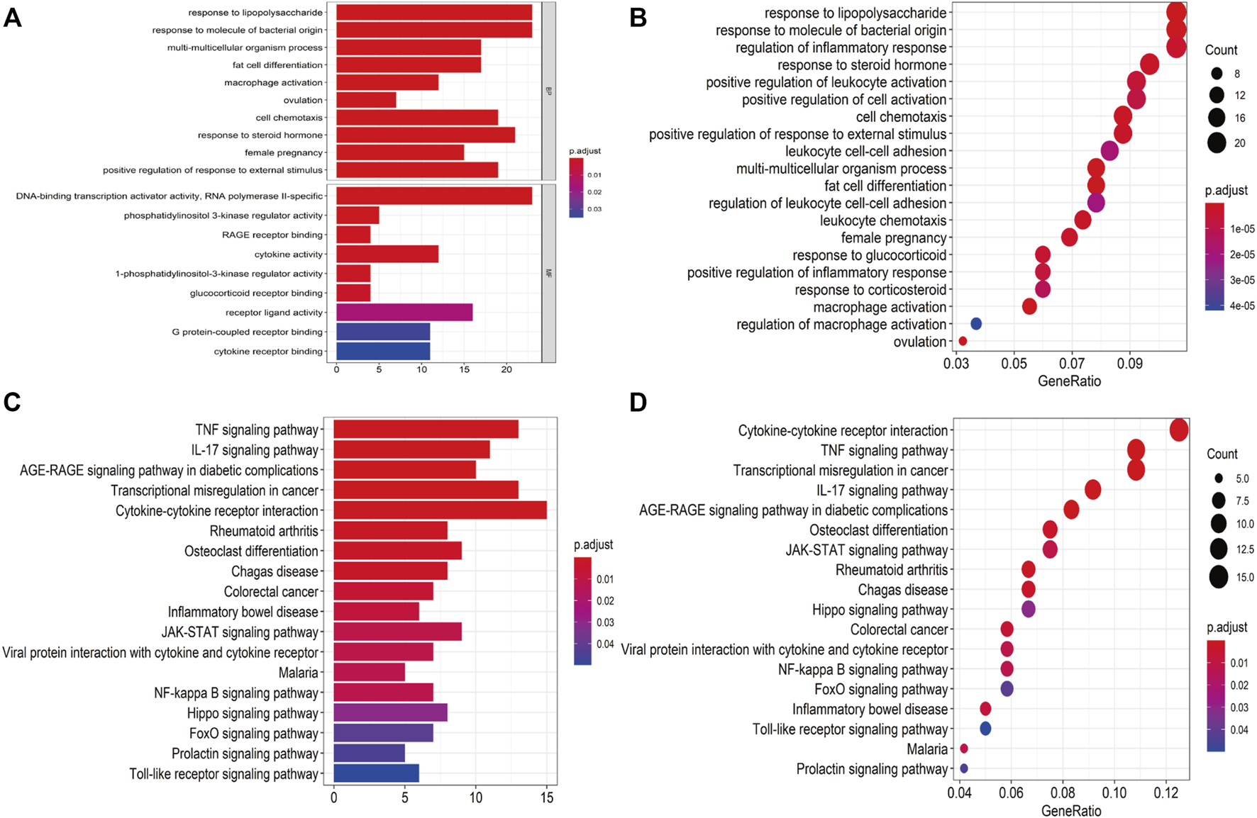 Functional annotation for DEGs. (A,B) Bar plot and dot plot of GO analysis for DEGs. (C,D) Bar plot and dot plot for KEGG pathway analysis for DEGs.