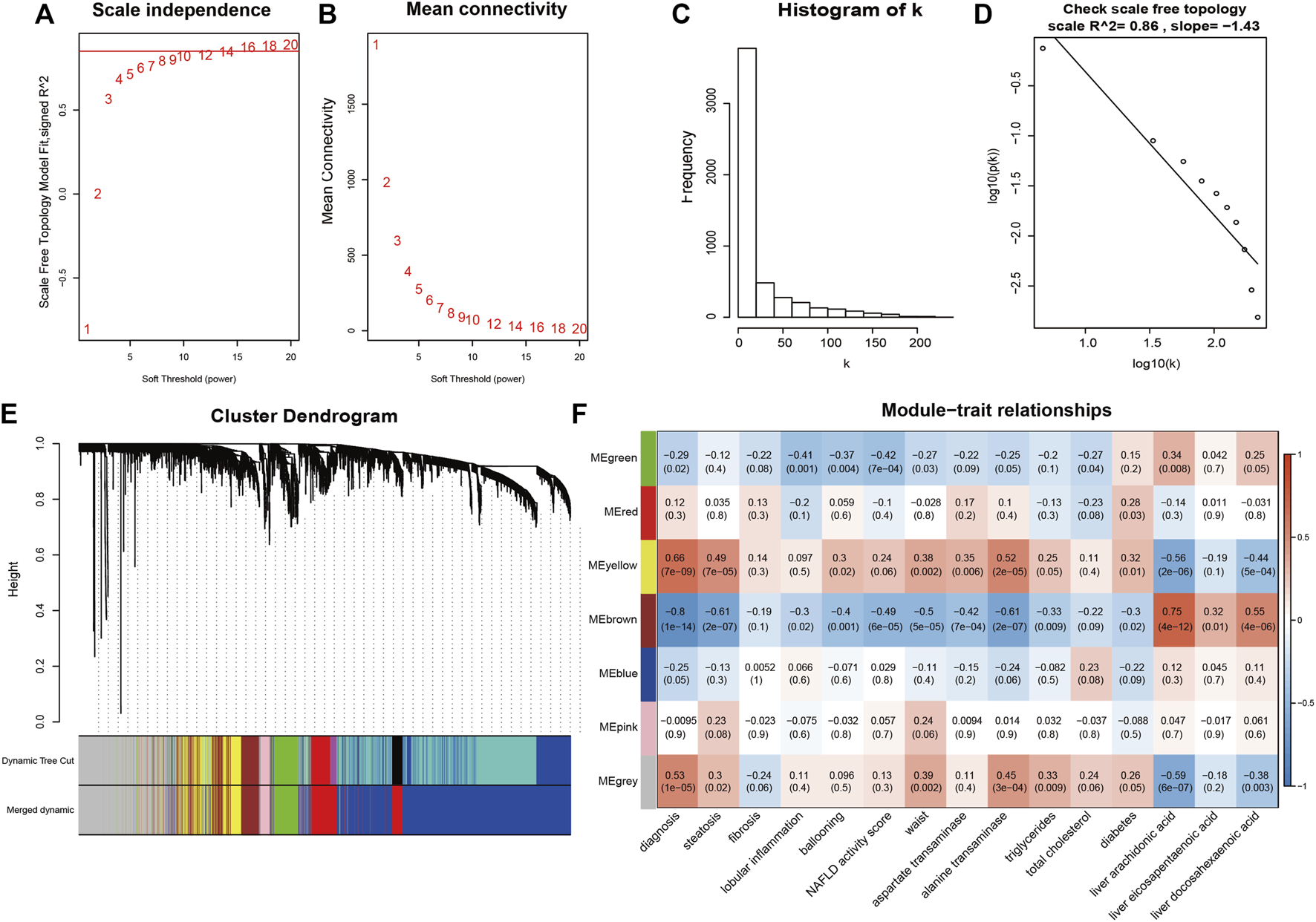 Weighted correlation network construction. (A,B) The soft-threshold β was chosen to be 16. (C,D) Log-log plot of whole-network connectivity distribution. The x-axis shows the logarithm of the whole network connectivity, and the y-axis is the logarithm of the corresponding frequency distribution. The network met the requirements of scale-free topology. (E) A total of 6 module was detected. (F) The correlation heatmap for gene modules and traits.