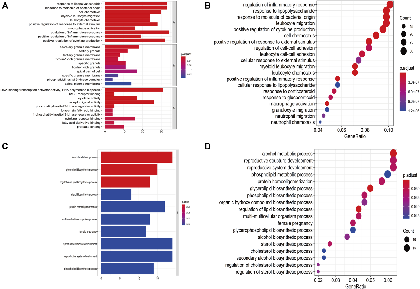 Functional annotation for PUFAs-related modules. (A,B) Bar plot and dot plot of GO analysis for brown module. (C,D) Bar plot and dot plot for GO analysis for yellow module.