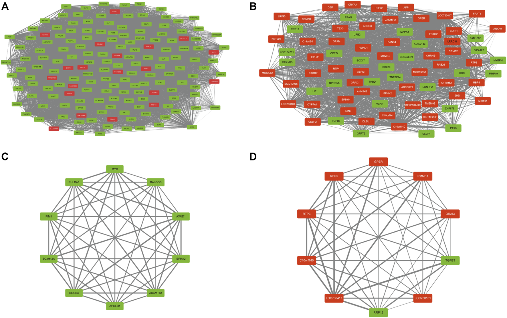 DEG co-expression network and hub genes. (A,B) DEG co-expression networks for brown and yellow modules. (C,D) hub genes for brown and yellow modules.