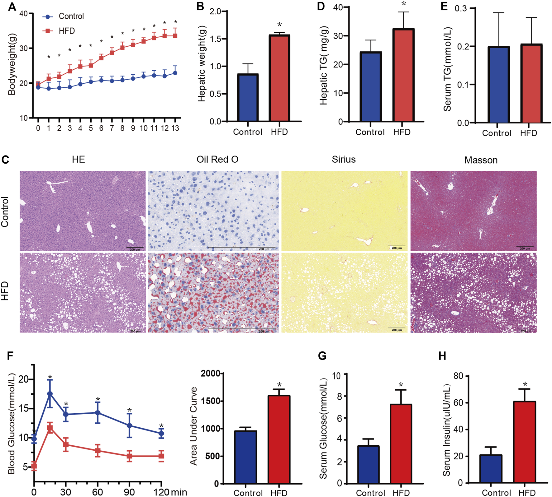 Evaluation of metabolic phenotype in the HFD-fed mice. (A,B) The body weight and hepatic weight between HFD and CD groups, respectively. n = 6. (C)Representative HE staining, Oil-red O staining, Masson staining, and Sirius red staining images of liver from each group. Black scale bar, 200 um. (D,E)The hepatic TG and serum TG between HFD and CD group. n = 5. (F) The oral glucose intolerance test (oral administration of 1.0 g/kg of glucose, after 12 h fasting). (G,H) Fasting serum glucose and insulin were measured. n = 5. Data are mean ± SD. *p < 0.05 versus CD group.