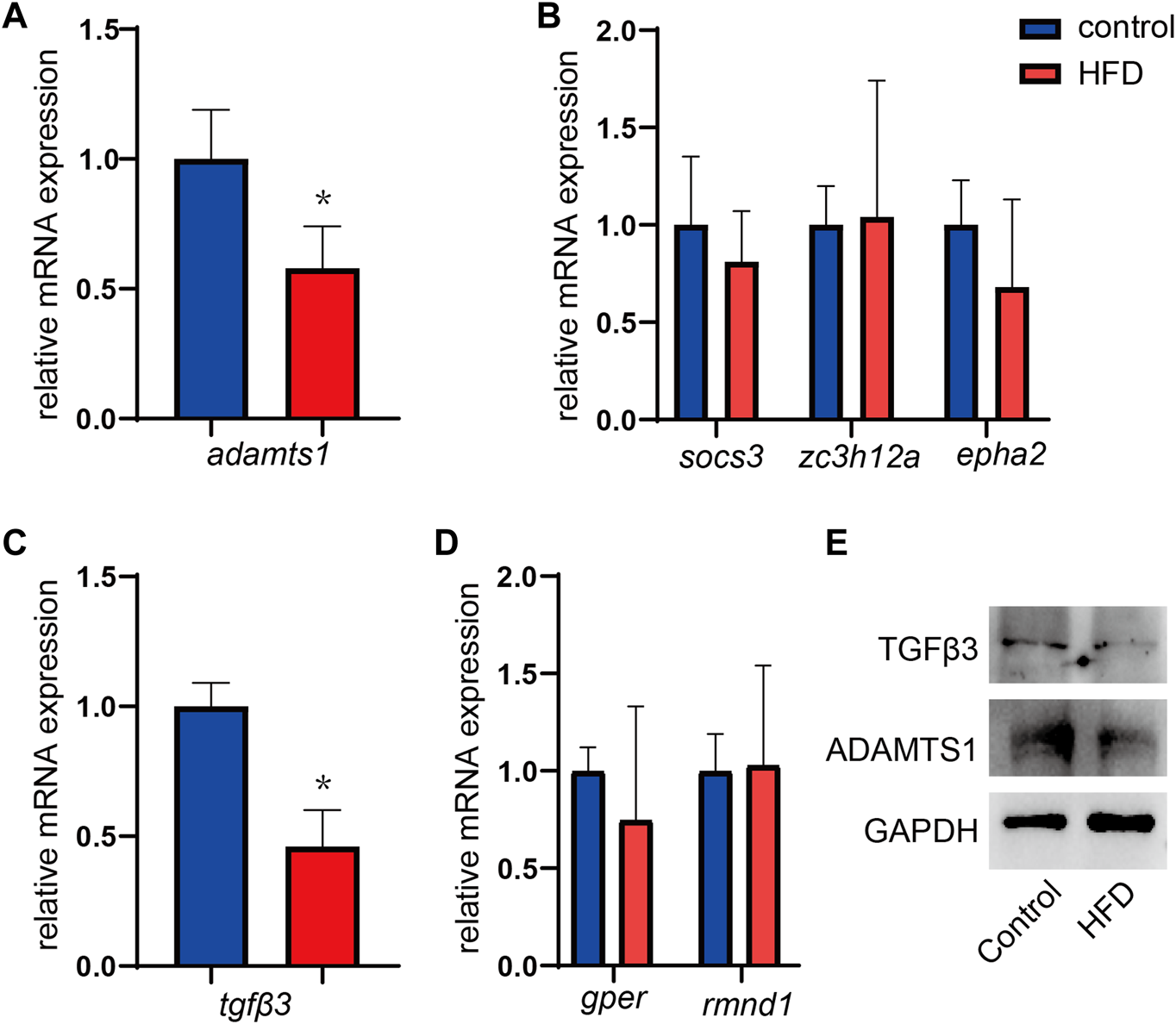 To verify whether the hub genes identified in the two DEG coexpression networks were variably expressed, mRNA was extracted from liver tissues, and gene expression was quantified by RT-qPCR. It has been shown that ADAM metallopeptidase with thrombospondin type 1 motif 1 (adamts1), which is a gene in the brown module, was expressed at significantly lower levels in HFD-fed mice, and these results matched expectations well (p = 0.005, Figure 8A). However, the expression of the socs3, epha2, and zc3h12a genes showed no significant group differences (all p > 0.05, Figure 8B). In the yellow module, significantly lower tgfβ3 expression was observed in the HFD-fed mice (p < 0.001, Figure 8C), although rmnd1 and gper expression did not differ significantly between the groups (all p > 0.05) (Figure 8D). The changes of TGFβ3 and ADAMTS1 at the protein levels were further confirmed by WB assays. HFD-fed mice showed lower expression of TGFβ3 and ADAMTS1 (Figure 8E).