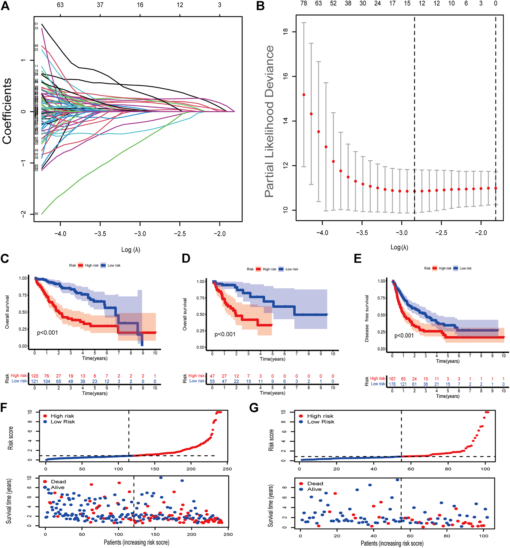 Identification of cuproptosis-associated lncRNAs with prognostic value in hepatocellular carcinoma (HCC) patients (A,B) LASSO Cox regression with a 10-fold cross-validation for the prognostic value of the cuproptosis-associated lncRNAs. (C) Kaplan-Meier analysis of the OS rate of training set patients in the high- and low-risk groups (D) Kaplan-Meier analysis of the OS rate of validation set patients in the high- and low-risk groups. (E) Kaplan-Meier analysis of the DFS rate of HCC patients in the high- and low-risk groups (F) Risk score distribution, survival status for patients in high- and low-risk groups from training set. (G) Risk score distribution, survival status for patients in high- and low-risk groups from validation set.