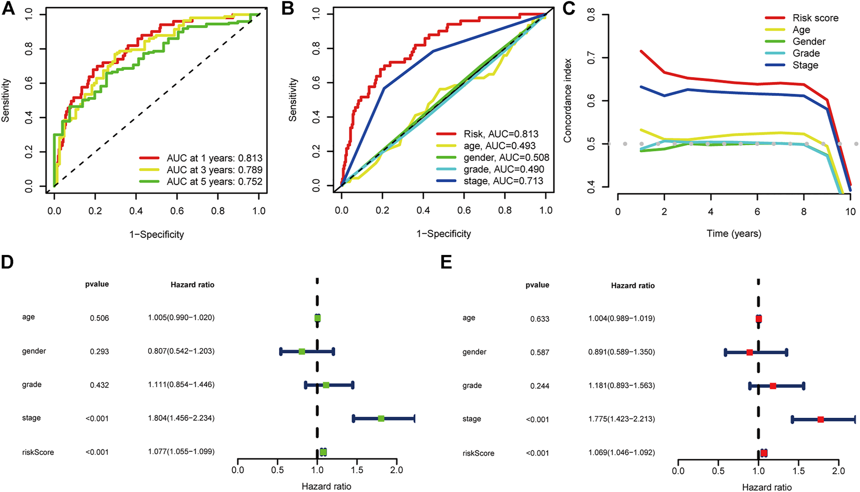 Evaluation of the prognostic cuproptosis-associated lncRNAs signature (A) ROC curve and AUCs at 1-year, 3-years and 5-years survival for the predictive signature. (B) The ROC curve of the risk score and clinicopathological variables (C) C index of the risk score and clinicopathological variables. (D) Forest plot for univariate Cox regression analysis. (E) Forest plot for multivariate Cox regression analysis.