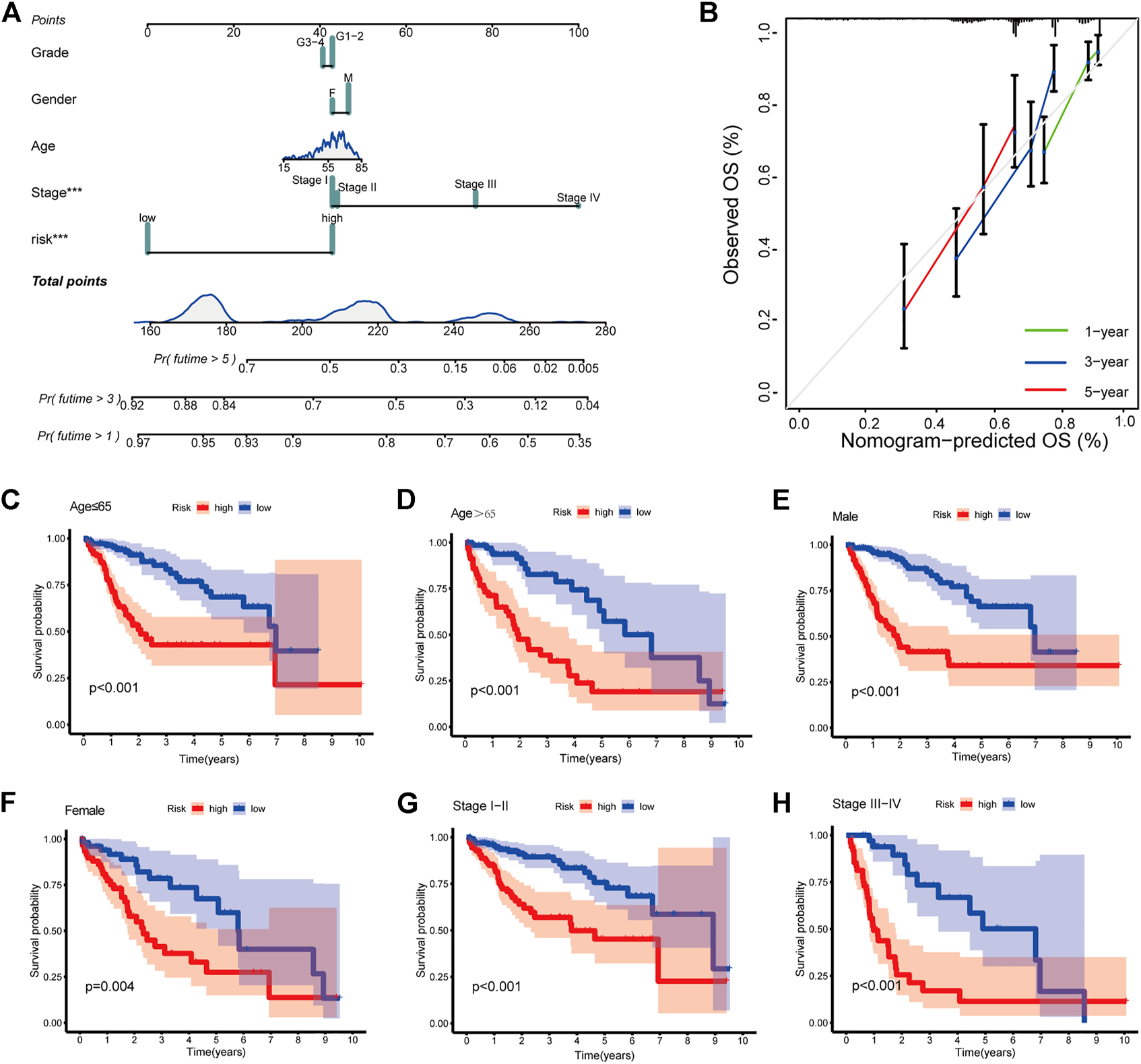 Clinical prognostic nomogram for survival prediction and subgroup analysis (A) A nomogram combining clinicopathological variables and risk score predicts 1, 3, and 5 years OS of HCC patients. (B) Calibration plots for 1-, 3-, and 5-years survival predictions (C–H) Subgroup survival analysis in the high- and low-risk groups, (C) Age ≤65 (D) Age > 65 (E) Male patients (F) Female patients (G) Stage Ⅰ-Ⅱ (H) Stage Ⅲ-Ⅳ.