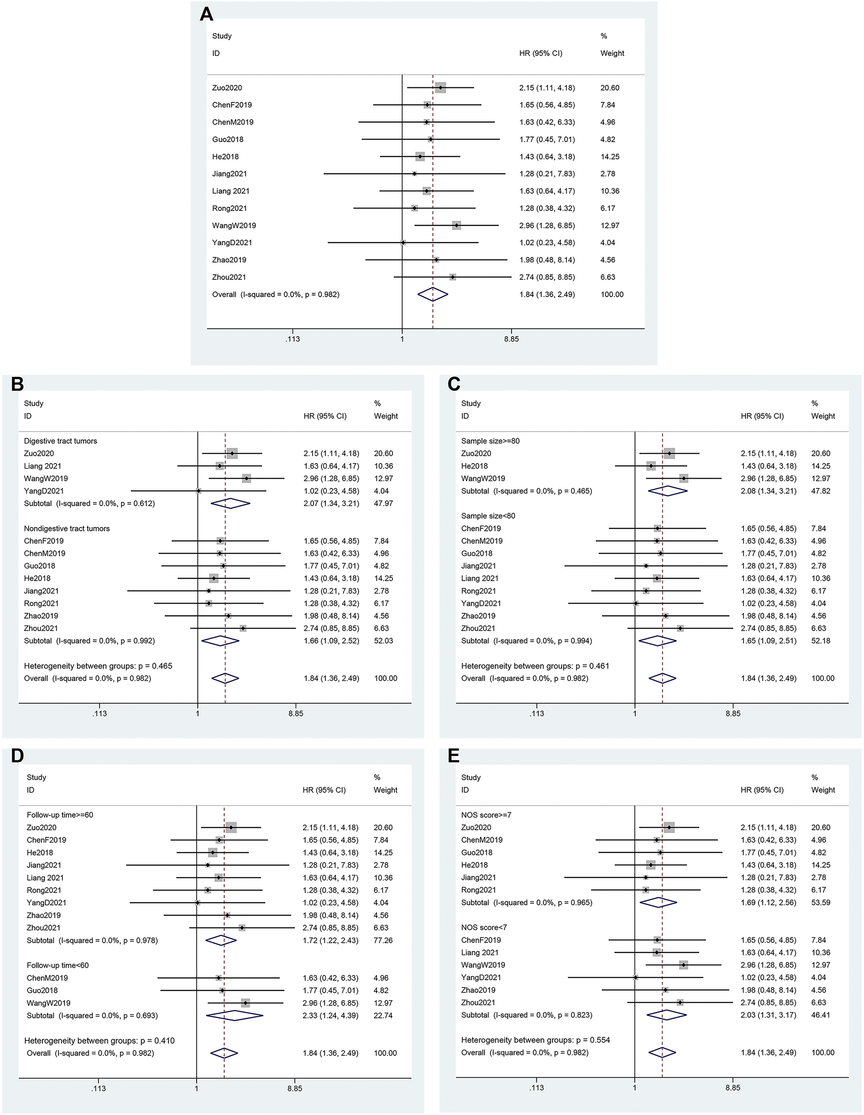 Twelve studies (Guo et al., 2018; He et al., 2018; Chen et al., 2019a; Wang et al., 2019a; Chen et al., 2019b; Zhao et al., 2019; Zuo et al., 2020; Jiang et al., 2021b; Liang et al., 2021; Rong et al., 2021; Yang et al., 2021; Zhou and Mu, 2021) reported the association between differential LINC00958 expression and OS, so we extracted data (pooled HRs and 95% CIs) from 883 patients from 12 studies. The fixed-effects model (I2 = 0.0%; PQ = 0.982) analysis showed that the high expression of LINC00958 was significantly correlated with OS (HR = 1.84; 95% CI: 1.36–2.49; p < 0.001; Figure 2A). Furthermore, we performed a subgroup analysis using the fixed-effects model based on the cancer type (digestive tract tumors and nondigestive tract tumors), sample size (n ≥ 80 or n < 80), follow-up time (≥60 months or <60 months), and NOS score (NOS scores ≥7 or <7) (Table 2). There is a significant correlation between each group and the expression of LINC00958, which is consistent with the results shown above. The data are as follows: digestive tract tumors (HR = 2.07; 95% CI: 1.34–3.21; p = 0.001) and non-digestive tract tumors (HR = 1.66; 95% CI: 1.09–2.52; p = 0.018) (Figure 2B); sample sizes greater than or equal to 80 (HR = 2.08; 95% CI: 1.34–3.21; p = 0.001) and less than 80 (HR = 1.65; 95% CI: 1.09–2.51; p = 0.018) (Figure 2C); follow-up was at least 60 months (HR = 1.72; 95% CI: 1.22–2.43; p = 0.002) and less than 60 months (HR = 2.33; 95% CI: 1.24–4.39; p = 0.009) (Figure 2D); NOS score greater than or equal to 7 (HR = 1.69; 95% CI: 1.12–2.56; p = 0.012) and less than 7 (HR = 2.03; 95% CI: 1.31–3.17; p = 0.002) (Figure 2E).