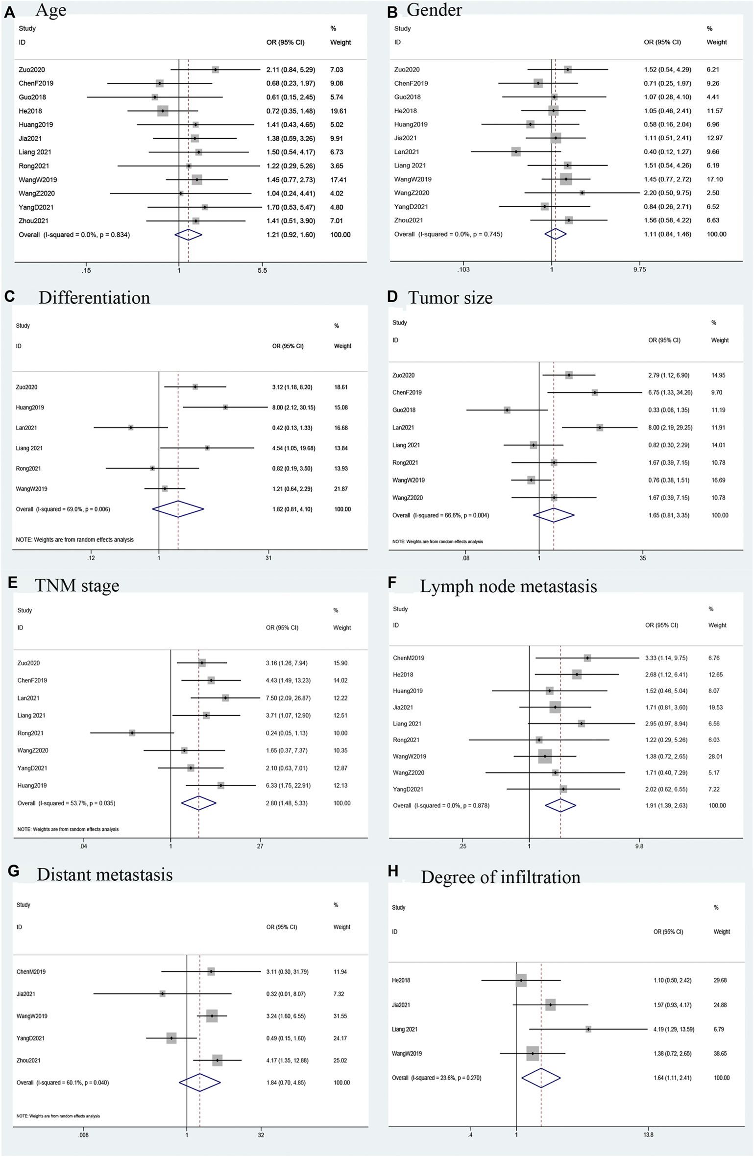 Fourteen studies that explored the relationship between the expression of LINC00958 in malignant tumors and clinical case characteristics. This relationship is shown in Figure 3 and Table 3. A total of 8 studies (Chen et al., 2019a; Huang et al., 2019; Wang et al., 2020; Zuo et al., 2020; Lan et al., 2021; Liang et al., 2021; Rong et al., 2021; Yang et al., 2021) (415 patients) reported the relationship between the expression of LINC00958 and tumor-node-metastases (TNM). We used a random-effects model (I2 = 53.7%; PQ = 0.035) analysis to show that the high expression of LINC00958 was significantly correlated with advanced TNM stage (OR = 2.80; 95% CI: 1.48–5.33; p = 0.002). We extracted the data of 729 patients from 9 studies (He et al., 2018; Wang et al., 2019a; Chen et al., 2019b; Huang et al., 2019; Wang et al., 2020; Jia et al., 2021; Liang et al., 2021; Rong et al., 2021; Yang et al., 2021), and used the fixed-effect model (I2 = 0.0%; PQ = 0.878) to show that the high expression of LINC00958 was significantly correlated with positive lymph node metastasis (LNM) (OR = 1.91; 95% CI: 1.39–2.63; p < 0.001). Data from 516 patients was extracted from 4 studies (He et al., 2018; Wang et al., 2019a; Jia et al., 2021; Liang et al., 2021) and we used the fixed-effect model (I2 = 23.6%; PQ = 0.270) to showed that the differential expression of LINC00958 was associated with degree of infiltration (OR = 1.64; 95% CI: 1.11–2.41; p = 0.013). However, we separately extracted data and analyzed that there was no significant correlation between age (OR = 1.21; 95% CI: 0.92–1.60; p = 0.174), sex (OR = 1.11; 95% CI: 0.84–1.46; p = 0.483), tumor size (OR = 1.65; 95% CI: 0.81–3.35; p = 0.166), distant metastasis (OR = 1.84; 95% CI: 0.70–4.85; p = 0.220), and tumor differentiation degree (OR = 1.82; 95% CI: 0.81–4.10; p = 0.146) with LINC00958 expression.