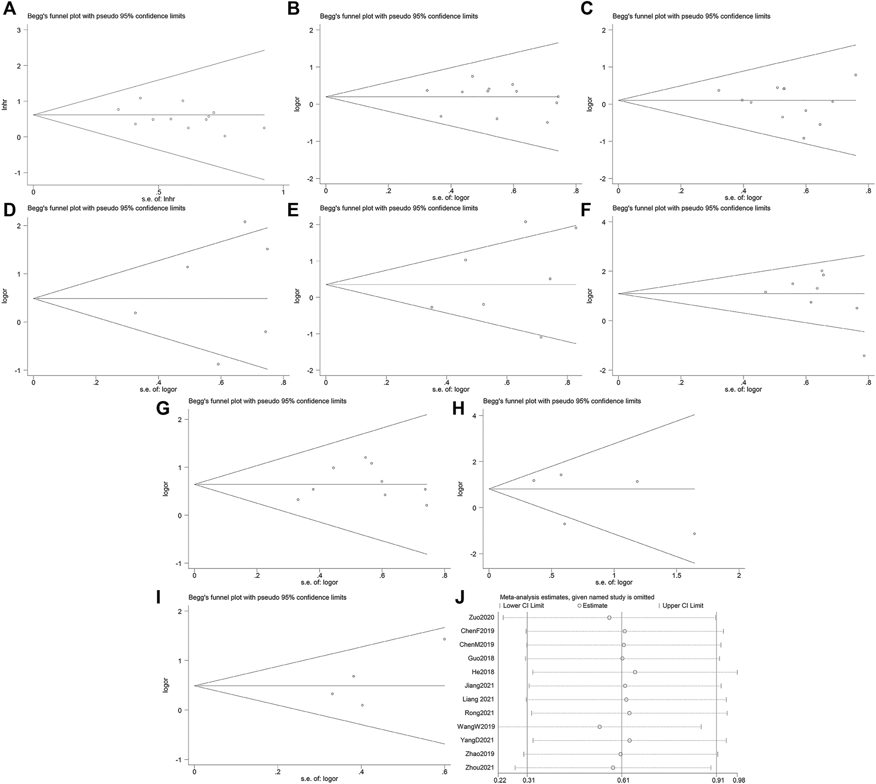 Begg’s funnel plots and sensitivity analysis. (A) Begg’s funnel plot for OS. (B) Begg’s funnel plot for age. (C) Begg’s funnel plot for sex. (D) Begg’s funnel plot for differentiation. (E) Begg’s funnel plot for tumor size. (F) Begg’s funnel plot for the TNM stage. (G) Begg’s funnel plot for lymph node metastasis. (H) Begg’s funnel plot for distant metastasis. (I) Begg’s funnel plot for degree of infiltration. (J) Sensitivity analysis for studies about OS.