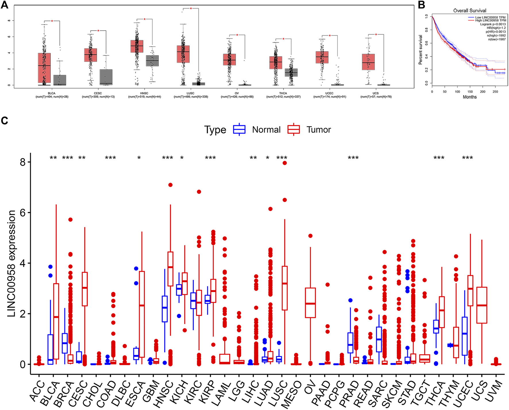 We further validated our results using GEPIA data. We found that high expression of LINC00958 can be observed in a variety of cancers, such as uterine corpus endometrial carcinoma (UCEC), cervical squamous cell carcinoma and endocervical adenocarcinoma (CESC), bladder urothelial carcinoma (BLCA), HNSC, lung squamous cell carcinoma (LUSC), ovarian serous cystadenocarcinoma (OV), thyroid carcinoma (THCA), and uterine carcinosarcoma (UCS) (Figure 5A). We aggregated survival data for nine cancers, including BLCA, CESC, HNSC, breast invasive carcinoma (BRCA), colon adenocarcinoma (COAD), glioma (LGG), liver hepatocellular carcinoma (LIHC), stomach adenocarcinoma (STAD), and UCEC. Ultimately, 3,979 patients were divided into two groups (high and low expression group) based on the median LINC00958 expression. Not surprisingly, our results were consistent with our prior analysis. The OS of the high expression group was shorter, which further verified that the high expression of LINC00958 was associated with a poor prognosis (Figure 5B).