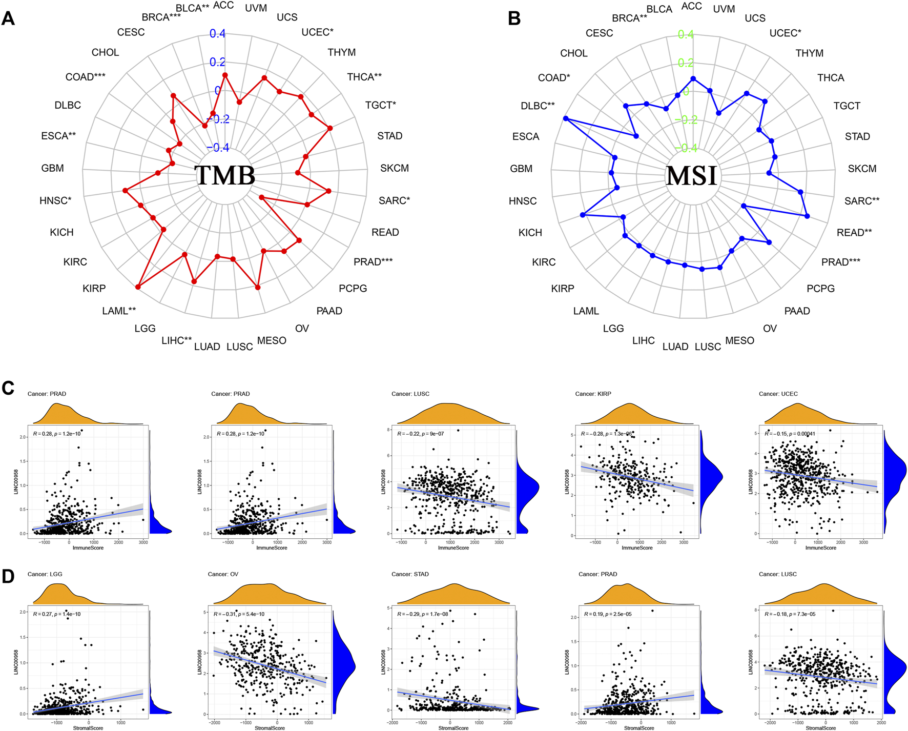 Using the ESTIMATE algorithm, we calculated stromal and immune cell scores in tumor tissues. LINC00958 expression correlation with tumor microenvironment (TME) was performed using the R-package “ggpubr,” “ggplot2,” and “ggExtra” options (p-value Cutoff: 0.001). Additionally, we calculated tumor mutational burden (TMB) and microsatellite instability (MSI) scores based on the TCGA database of patients’ somatic mutation profiles and employed Spearman’s method to evaluate the relevance of LINC00958 expression to TMB and MSI. The results were visualized using the R-package “fmsb” option.
