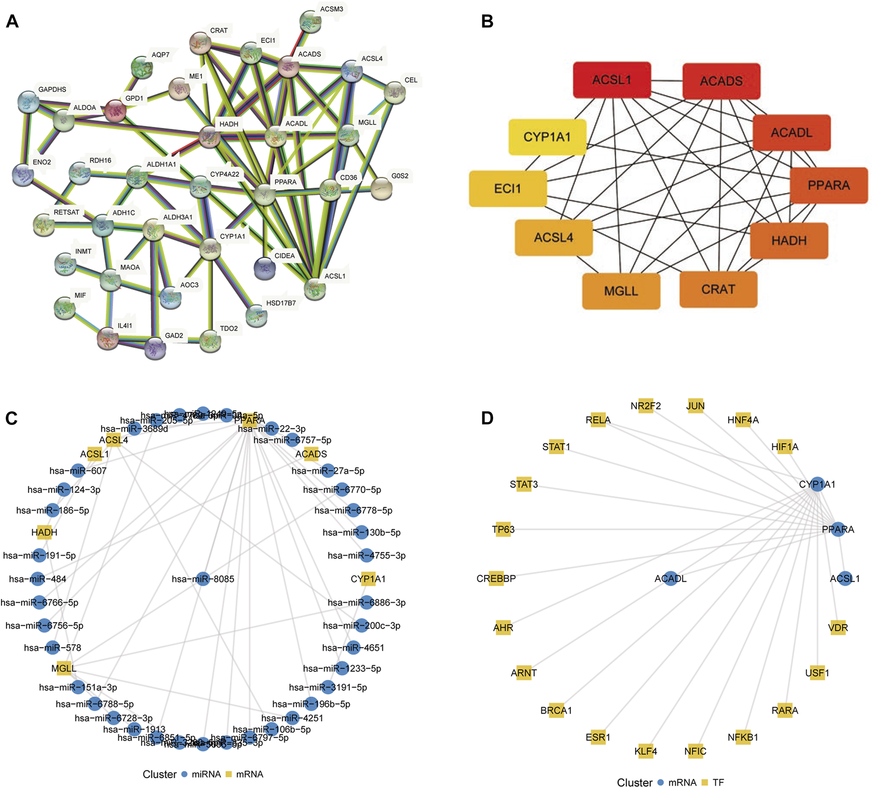 Construction of regulatory networks. (A) Protein–protein interaction network of fatty acid metabolism-related differentially expressed genes constructed using the STRING database. (B) Ten hub genes selected using the CytoHubba plugin. The color represents the gene MCC score, which ranges from 8 to 369, where the redder the color the higher the MCC score and the more orange the color the lower the MCC score. (C) mRNA–miRNA network constructed using the miRWalk database. (D) mRNA–transcription factor network constructed using the TRRUST database.