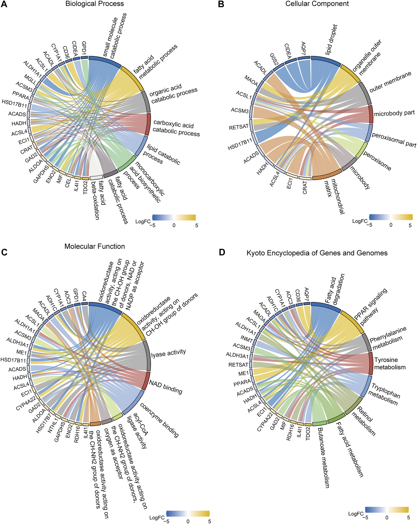 In order to identify DEGs related to FA metabolism in breast cancer, we conducted GO and KEGG enrichment analyses. GO analysis revealed that DEGs were mainly involved in small molecule catabolism (Supplementary Table S1, Figure 4A). Enriched cellular components included lipid droplets, organelle outer membranes, outer membranes, microbody parts, peroxisomal parts, peroxisomes, microbodies, and mitochondrial matrix (Figure 4B). As for the molecular functions, NAD and NADP were the most prevalent acceptors for oxidoreductases, lyases, NAD binding, coenzyme binding, acyl-CoA ligases, and oxidoreductases acting on CH-NH2 groups of donors (Figure 4C). Based on KEGG functional analysis, DEGs were mostly affected by pathways such as FA metabolism and degradation; PPAR signaling pathway; phenylalanine, tyrosine, and tryptophan metabolism; retinol metabolism; and butanoate metabolism (Figure 4D, Supplementery Figure S2, Supplementary Table S2).