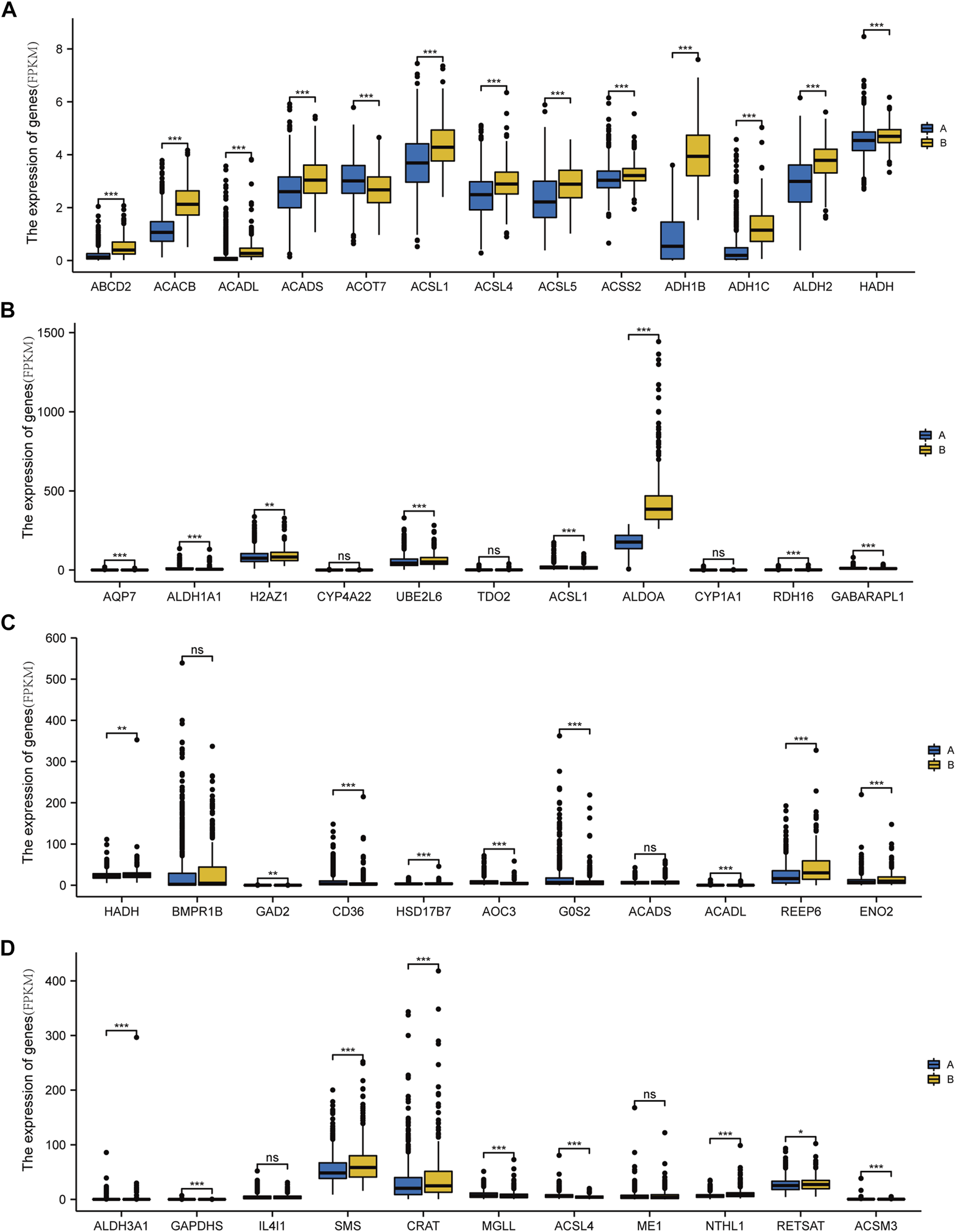 Differential expression of genes involved in fatty acid metabolism in different types of breast cancer. (A) Expression of ADH1C, NMT, MIF, HSD17B11, MAOA, PPARA, CIDEA, CEL, ECI1, GPD1, and CA4 in breast cancer subtype A and B groups. (B) Expression levels of AQP7, ALDH1A1, H2AZ1, CYP4A22, UBE2L6, TDO2, ACSL1, ALDOA, CYP1A1, RDH16, and GABARAPL1 in subtype A and B groups of breast cancer. (C) Export of HADH, BMPR1B, GAD2, CD36, HSD17B7, AOC3, G0S2, ACADS, ACADL, REEP6, and ENO2 in subtype A and B groups of breast cancer. (D)ALDH3A1, GAPDHS, IL4I1, SMS, CRAT, MGLL, ACSL4, ME1, NTHL1, RETSAT, and ACSM3 expression in the breast cancer subtype A and B groups. (ns, p ≥ 0.05; *, p < 0.05; **, p < 0.01; ***, p < 0.001).