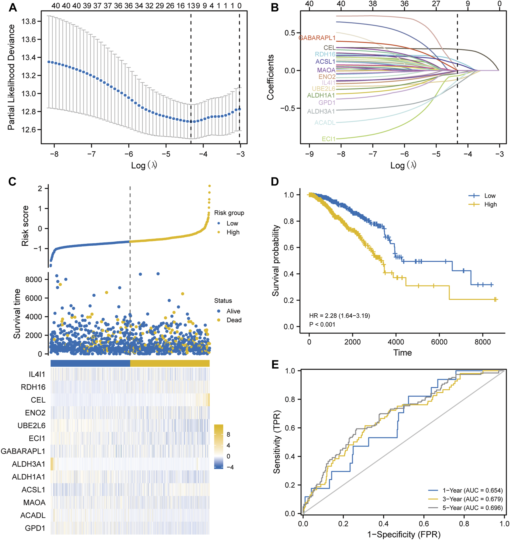 Modeling prognosis using Lasso analysis. (A) Determination of the Lasso coefficient. (B) Lasso variable trajectory plot. (C) Risk factor plot. (D) Survival analysis. (E) Receiver operating characteristic curve.Z.