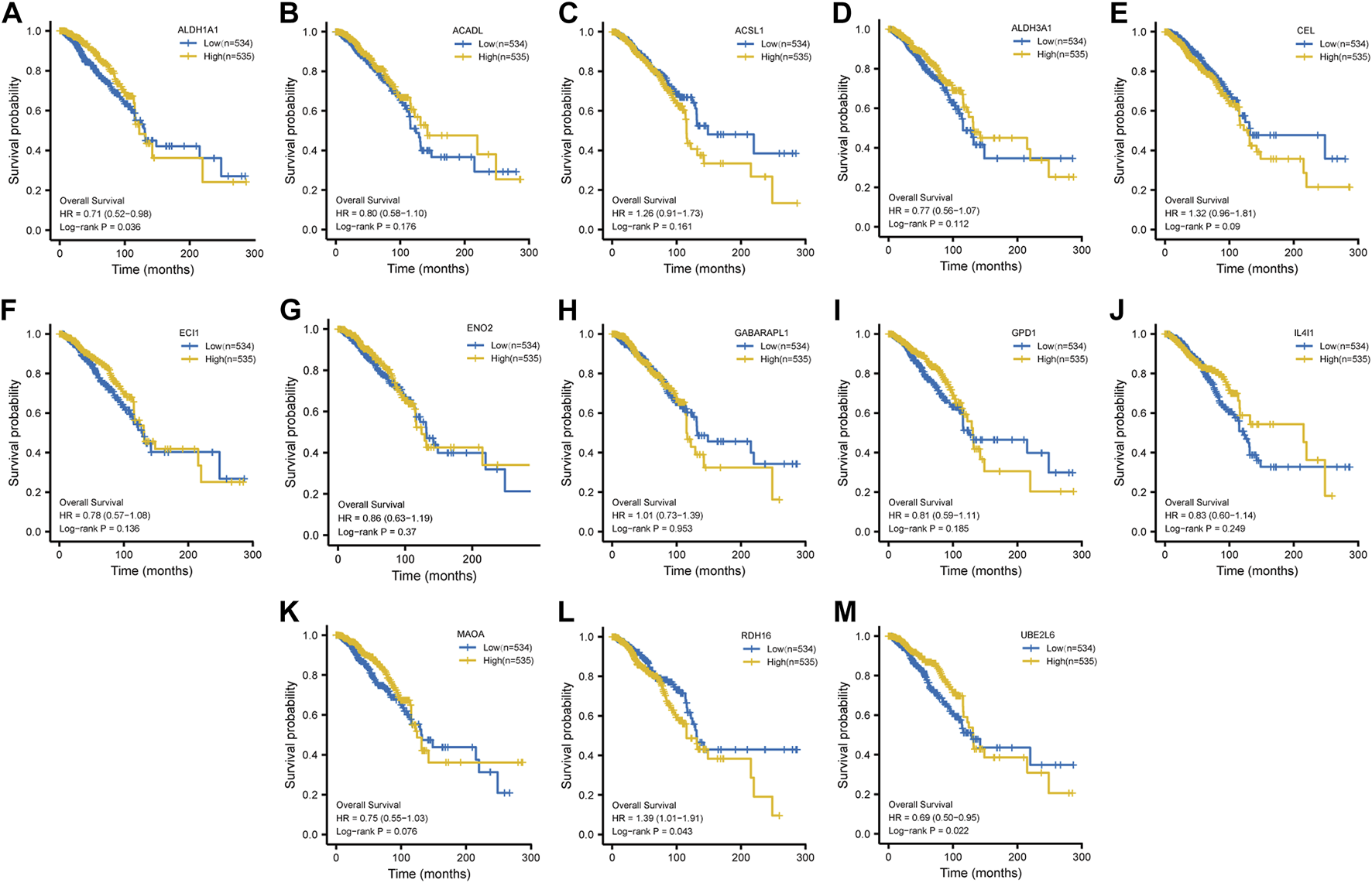 Kaplan–Meier survival analysis. Survival curves of ALDH1A1(A), ACSL1(B), ALDH1A1(C), ALDH3A1(D), CEL(E), ECI1(F), ENO2(G), GABARAPL1(H), GPD1(I), IL4I1(J), MAOA(K), RDH16(L), and UBE2L6(M).