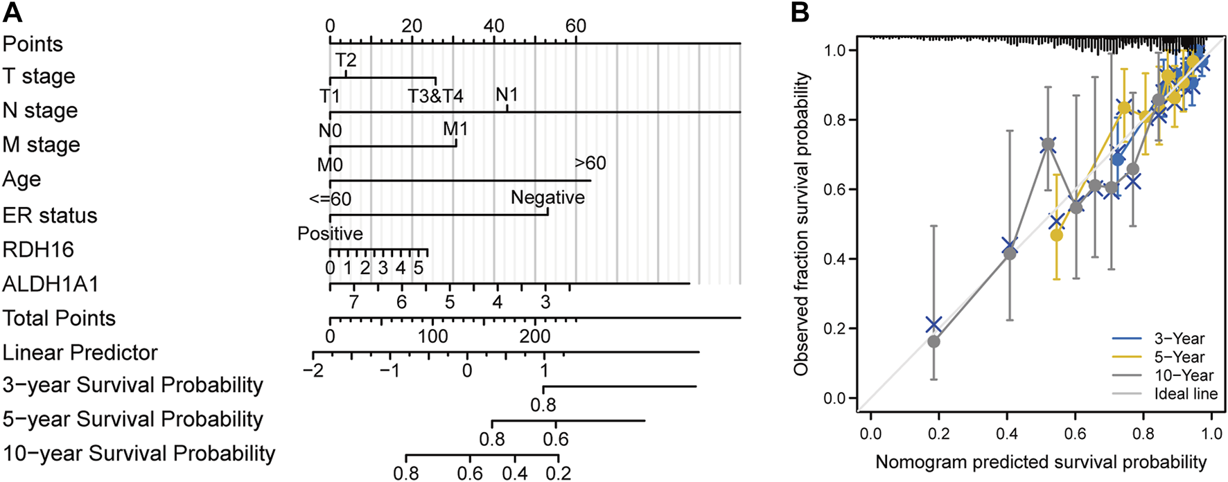 After Lasso analysis of 44 FA metabolism-related DEGs, the prognostic risk score model was constructed using 13 genes: IL4I1, RDH16, CEL, ENO2, UBE2L6, ECI1, GABARAPL1, ALDH3A1, ALDH1A1, ACSL1, MAOA, ACADL, and GPD1 (Figures 7A–C). Furthermore, the area under the time-dependent receiver operating characteristic curve indicated that the accuracy of this prognostic model increased with increased survival time (Figures 7D, E). After further analysis of the clinical data from the included studies (Supplementary Table S3), Kaplan–Meier survival analysis revealed that high expression levels of both ALDH1A1 and UBE2L6 were protective against breast cancer (HR 0.71 and 0.69, respectively, p < 0.05), whereas high expression levels of RDH16 were associated with a high risk of developing the disease (HR = 1.39, p < 0.05) (Figure 8). Univariate and multifactorial Cox results (Supplementary Table S4) showed that age (p < 0.001), estrogen receptor (ER) positive status (p = 0.042), and RDH16 expression (p = 0.026) were independently associated with poor outcomes for TCGA-BRCA patients. By combining the results of Cox analysis and the clinical characteristics, we constructed a prognostic model and evaluated the risk probabilities (Figure 9). The calibration curves indicate that the model is predictive for 3-, 5-, and 10-year prognoses.