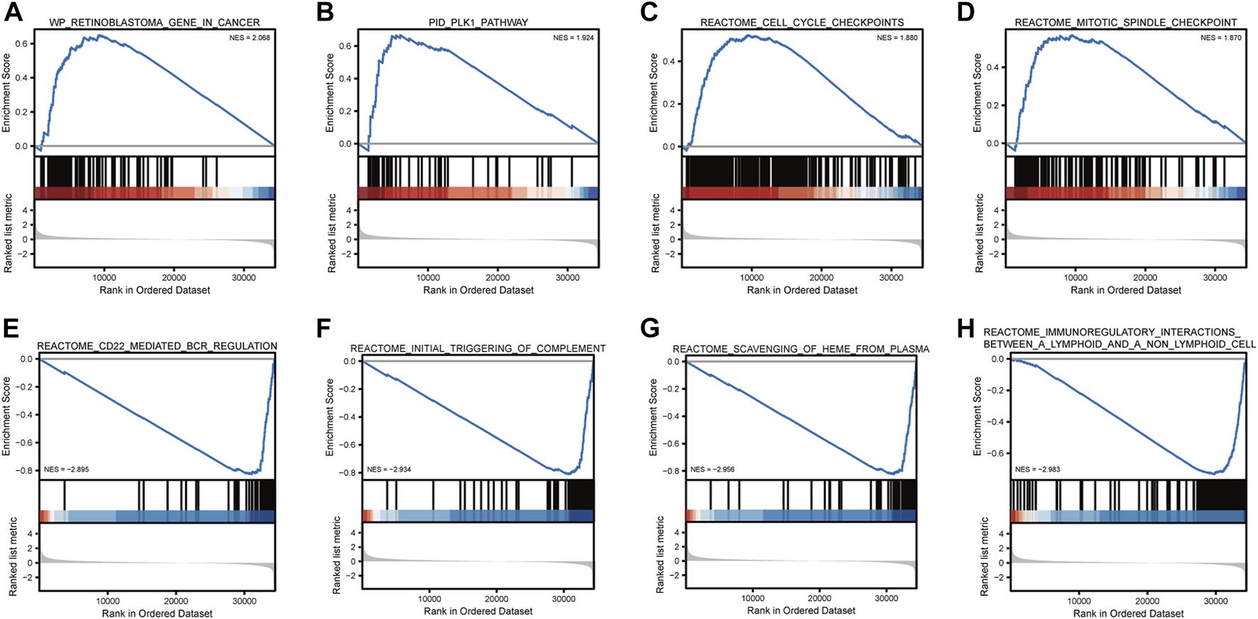 Gene set enrichment analysis. Breast cancer is mainly enriched in WP retinoblastoma gene in cancer (A), PID PLK1 pathway (B), reactome cell cycle checkpoints (C), reactome mitotic spindle checkpoint Biocarta MCM pathway (D), reactome CD22-mediated BCR regulation (E), reactome initial triggering of complement (F), reactome scavenging of heme from plasma (G), and reactome immunoregulatory interactions between lymphoid and non-lymphoid cells (H).