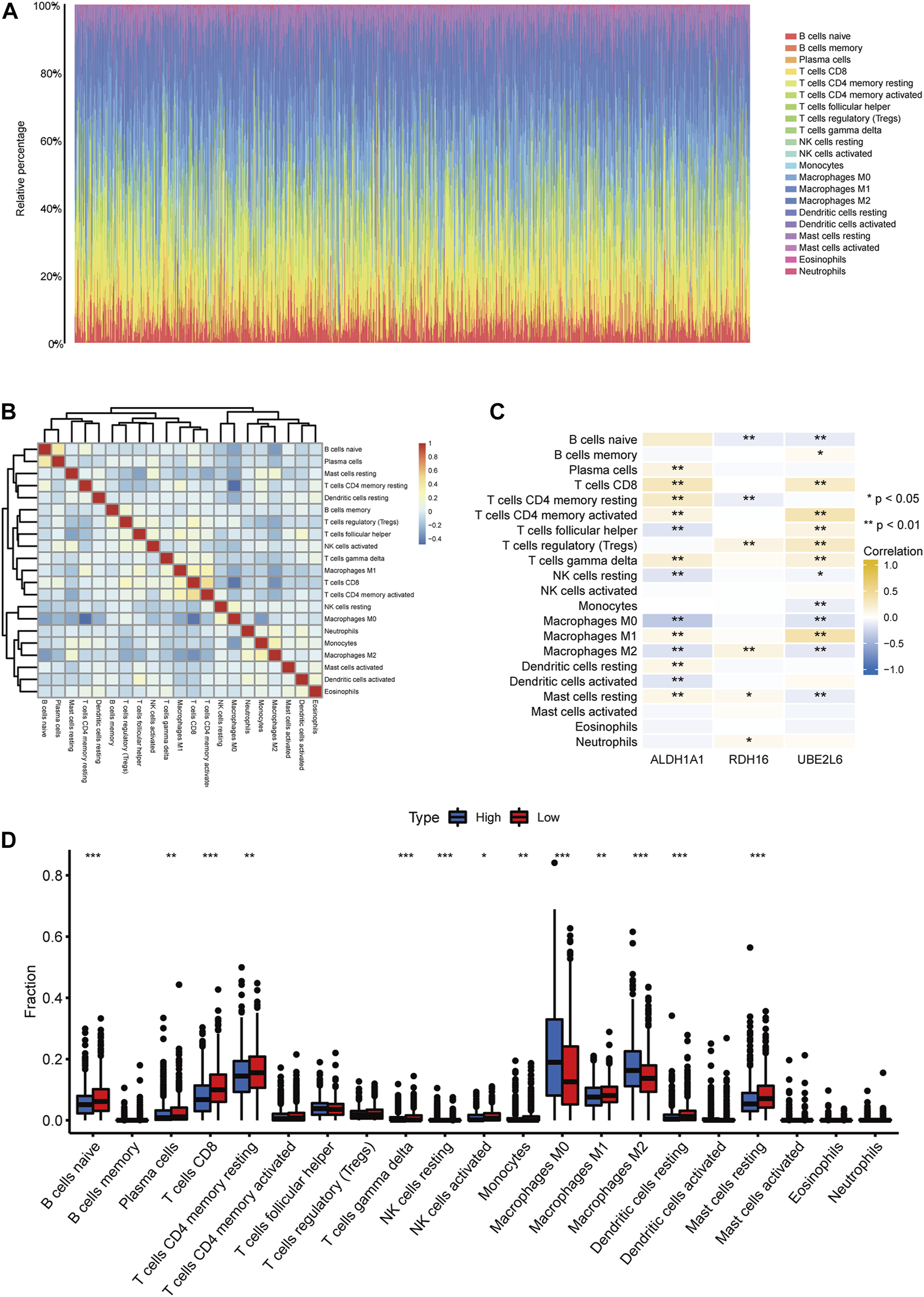 Results: High expression levels of ALDH1A1 and UBE2L6 prevented breast cancer, whereas high RDH16 expression levels increased its risk. Our comprehensive assessment of the association between prognostic risk scoring models and tumor microenvironment characteristics showed significant differences in the abundance of various immune cells between high- and low-risk breast cancer patients.