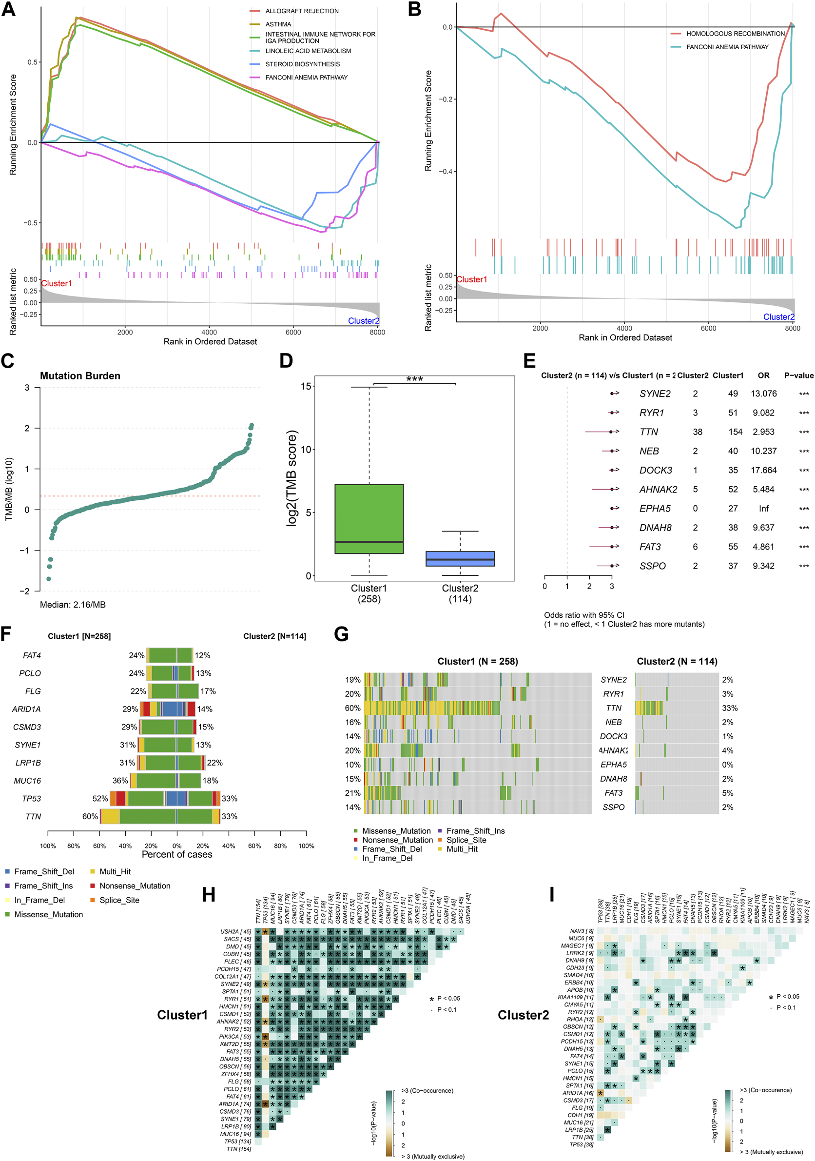 Differences in signaling pathways and somatic mutation between the two DNA damage repair-based subtypes across TCGA-STAD. (A) GSEA for the enrichment levels of signaling pathways in the two subtypes. For the enrichment score line chart, the horizontal axis denotes the sorted genes, and the vertical axis denotes the corresponding running enrichment score. The peak in the line graph is the enrichment score of the gene set, and the gene before the peak is the core gene under the gene set. In the middle of the panel, lines mark genes under that gene set. The lower part of the panel shows the distribution of rank values for all genes. (B) GSEA for the enrichment levels of DNA damage repair pathways in the two subtypes. (C) Distribution of TMB score across TCGA-STAD. (D) Comparison of TBM score between subtypes. (E) Odd ratio (OR) of mutated genes between subtypes. OR>1 denotes that cluster1 has more mutants than cluster2. (F,G) The frequency of the top ten mutated genes across the two subtypes. (H,I) Relationships between mutated genes in cluster1 and cluster2, respectively.