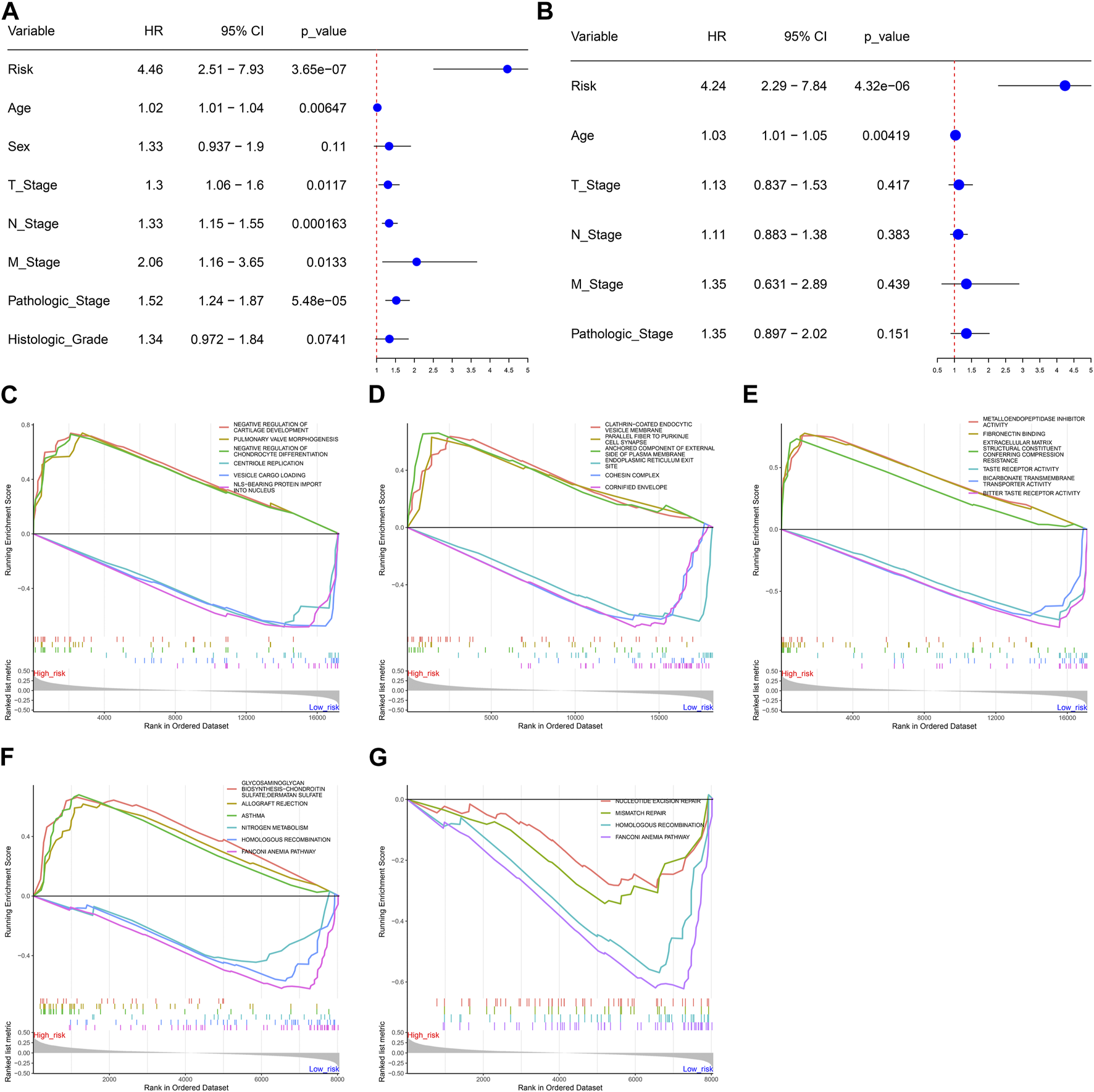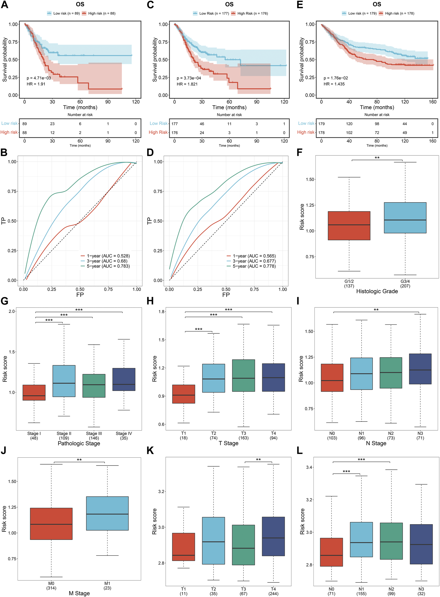 For revealing the prognostic implication of DNA damage repair, prognosis-related DNA damage repair-relevant genes with p < 0.01 were selected for least absolute shrinkage and selection operator (LASSO) analysis utilizing glmnet package (Engebretsen and Bohlin, 2019). Genes with non-zero coefficients were chosen with ten-fold cross-validation. TCGA-STAD samples were randomly classified as training and test datasets with a ratio of 1:1. Meanwhile, GSE84433 dataset was adopted as external verification. Thereafter, a DNA damage repair-relevant gene signature was generated, following the formula: . All cases were classified as low- and high-risk groups through the median RiskScore. K-M curves of OS were conducted, and 1-, 3-, and 5-year receiver operating characteristic (ROC) curves were plotted with timeROC package. Uni- and multivariate Cox regression approaches were utilized for examining whether the RiskScore acted as an independent prognostic parameter.