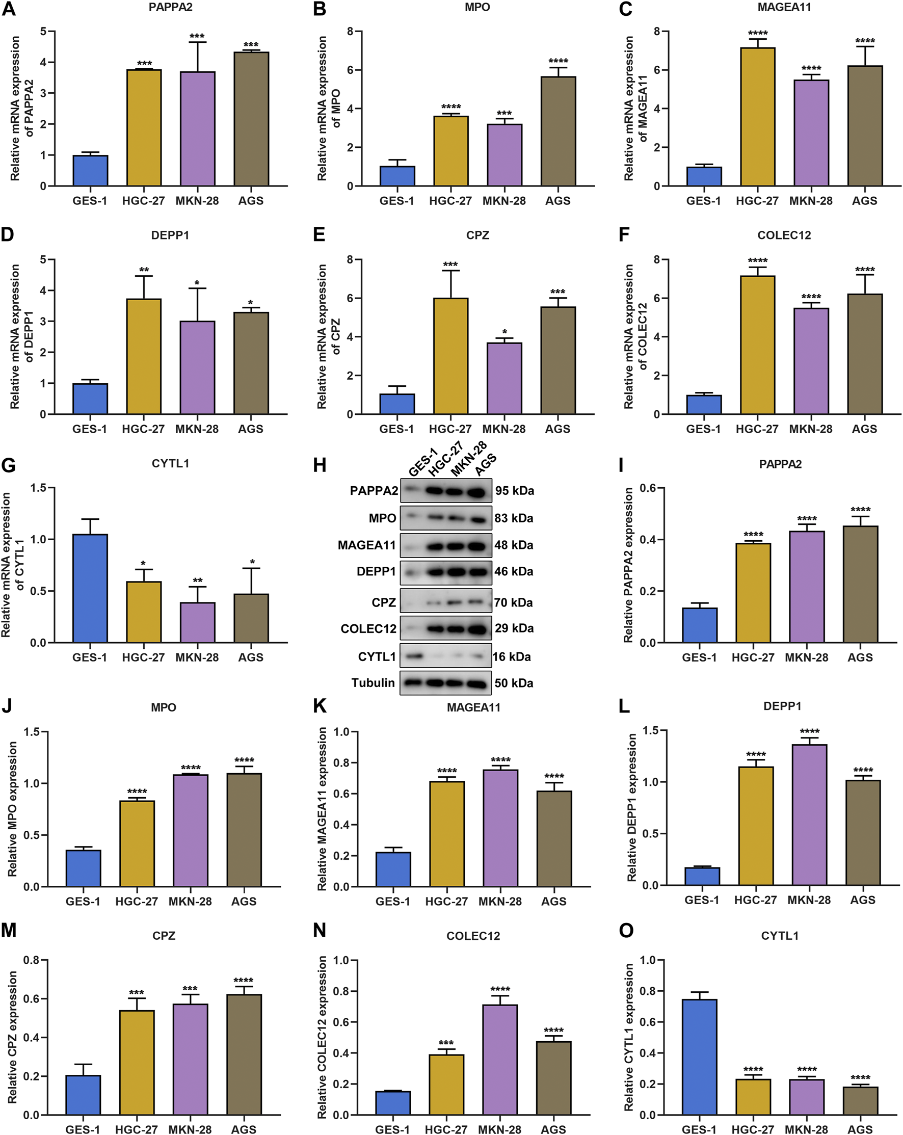 RIPA lysis (Solarbio) was adopted for extracting total protein, and protein samples electrophoresed onto polyacrylamide gels were loaded onto PVDF membranes that were then blocked utilizing 5% BSA for 1 hour. The membranes were probed with primary antibody of PAPPA2 (PA5-21046; ThermoFisher, United States), MPO (1/1000; ab208670; Abcam, United States), MAGEA11 (1/500; ab96236), DEPP1 (1/1000; ab230977), CPZ (15944-1-AP; Proteintech, China), COLEC12 (1/1000; ab278081), CYTL1 (1/500; ab129767) or Tubulin (1/5000; ab7291) at 4°C in a shaker overnight. Incubation with HRP goat anti-rabbit IgG (1/10,000; ab288151) for 1 hour, followed by development. ImageJ software was adopted for grayscale analysis.