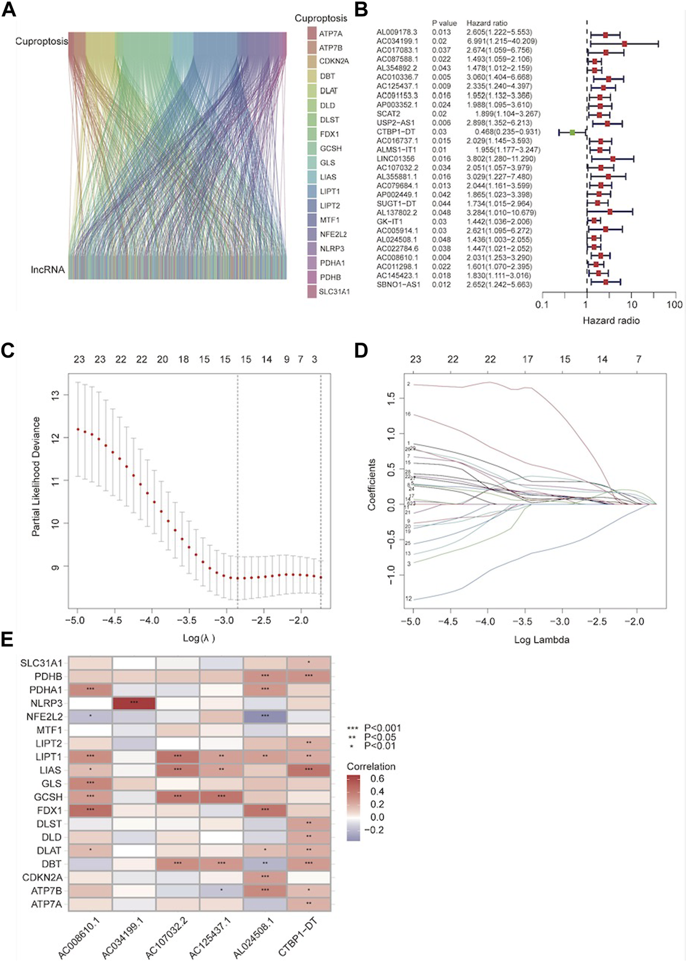 Identification of the cuproptosis-related lncRNAs (CRLs). (A) Co-expression of lncRNA and cuproptosis-related genes. (B) The forest map shows the lncRNA of different risk groups; red represents high-risk lncRNAs and green represents low-risk lncRNAs. (C) A general cross-validation curve of the paired likelihood deviance. (D) LASSO coefficients of prognostic genes. (E) A correlation heatmap revealed the association between CRLs and cuproptosis-related genes. Positive correlations are shown in red while negative correlations are represented in blue.