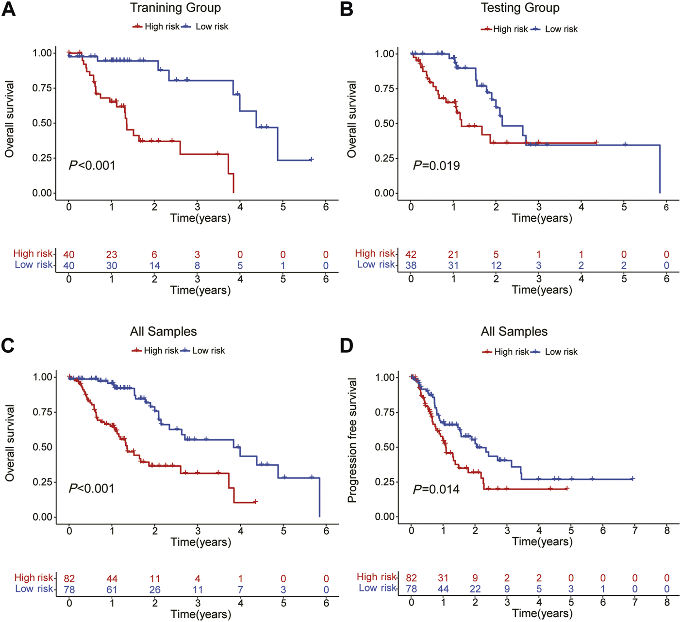 OS and PFS in each subgroup predicted by Kaplan-Meier survival curves. (A) OS in the training group. (B) OS in the testing group. (C) OS in all samples. (D) PFS in all samples.