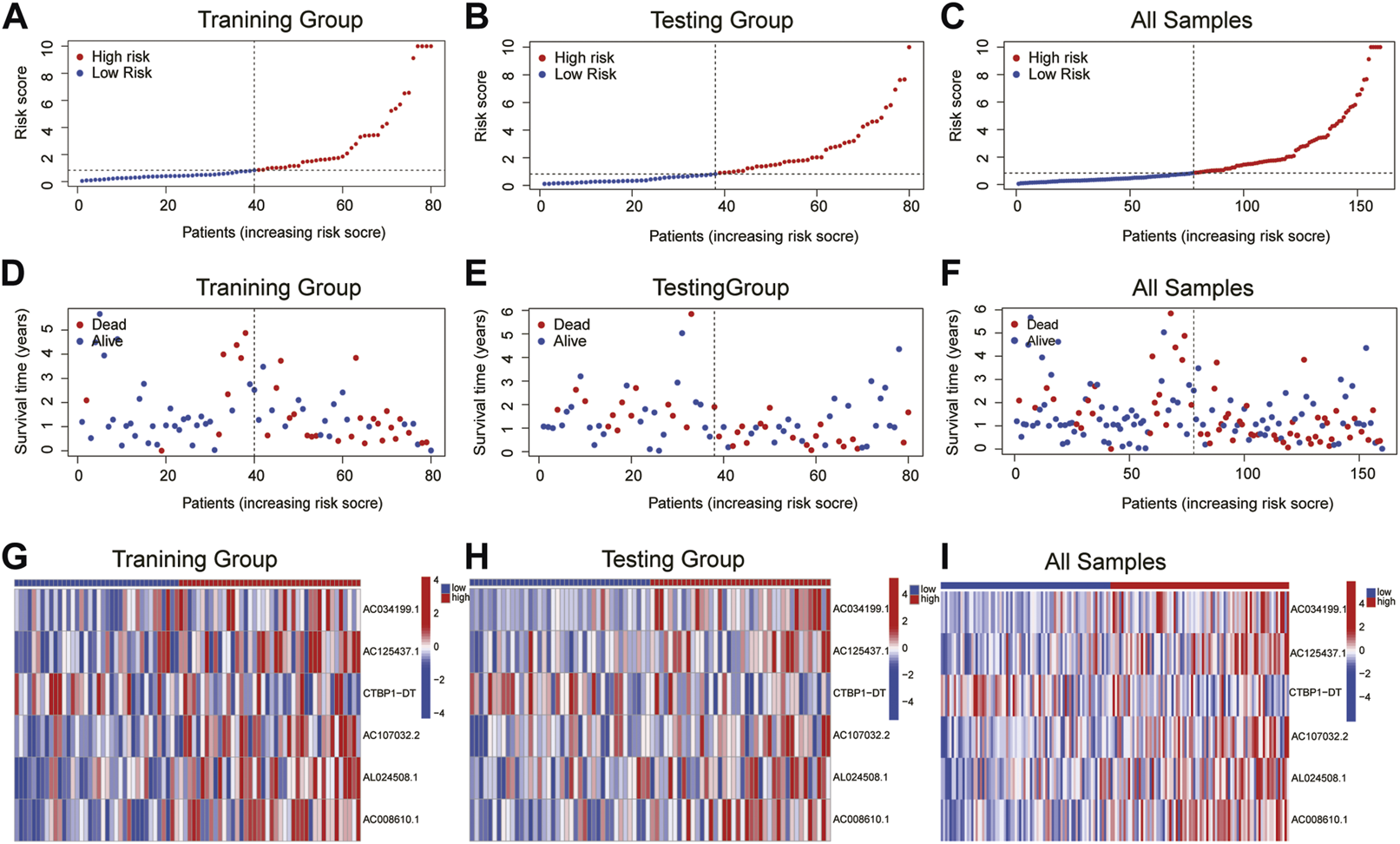 The distribution of OS risk scores and heat maps of 6 lncRNAs. (A–C) The distribution of OS risk scores. (D–F) Survival time and status. (G–I) Heat maps of 6 lncRNA expressions.