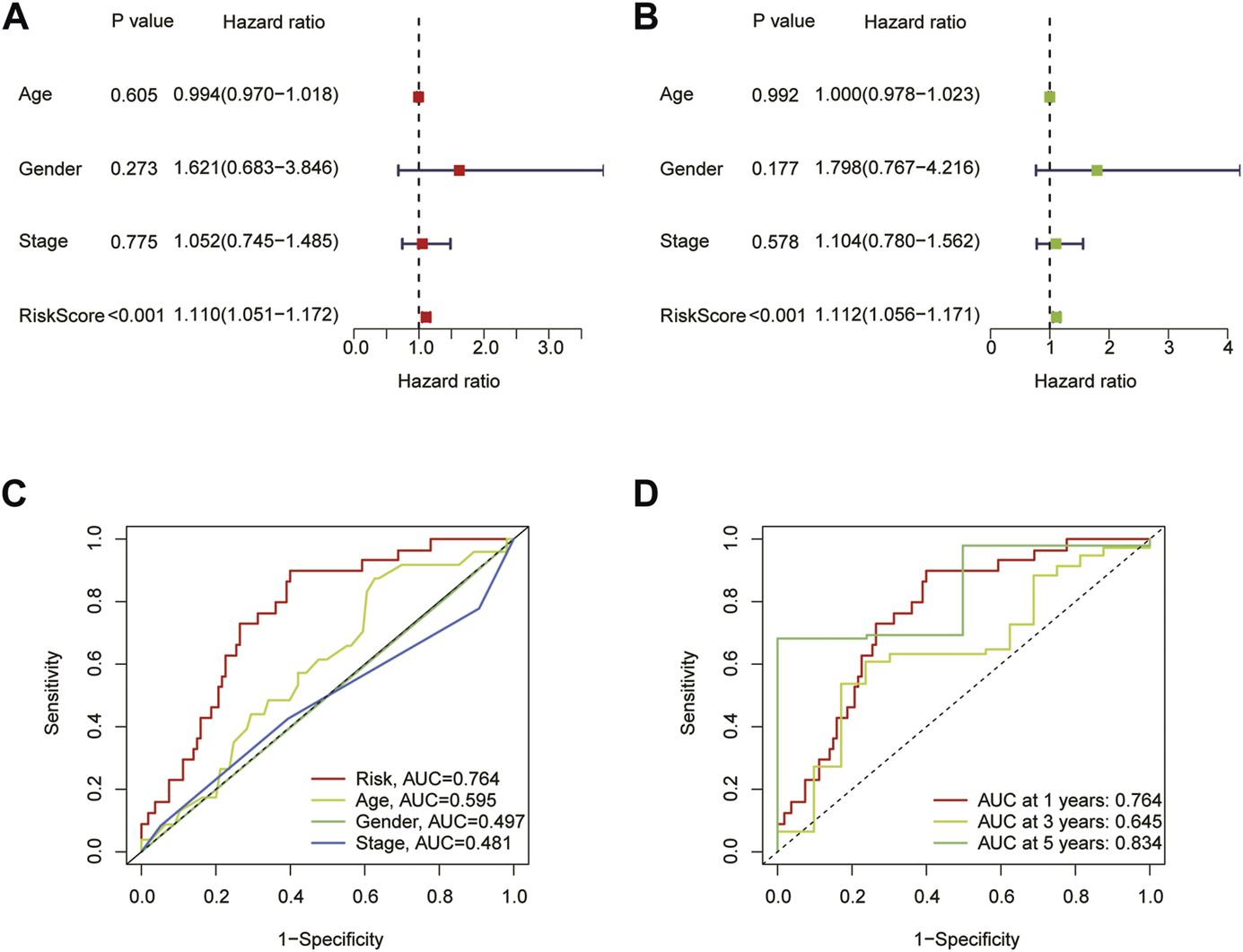 The prognostic value of the signature for ESCA. (A) Univariate Cox analysis based on age, gender, stage, and risk scores. (B) Multivariate Cox analysis based on age, gender, stage, and risk scores. (C) Comparison of the predictive accuracy of risk models and clinicopathological characteristics. (D) ROC of the risk characteristic based on a whole-group prediction of 1, 3, and 5-year OS.