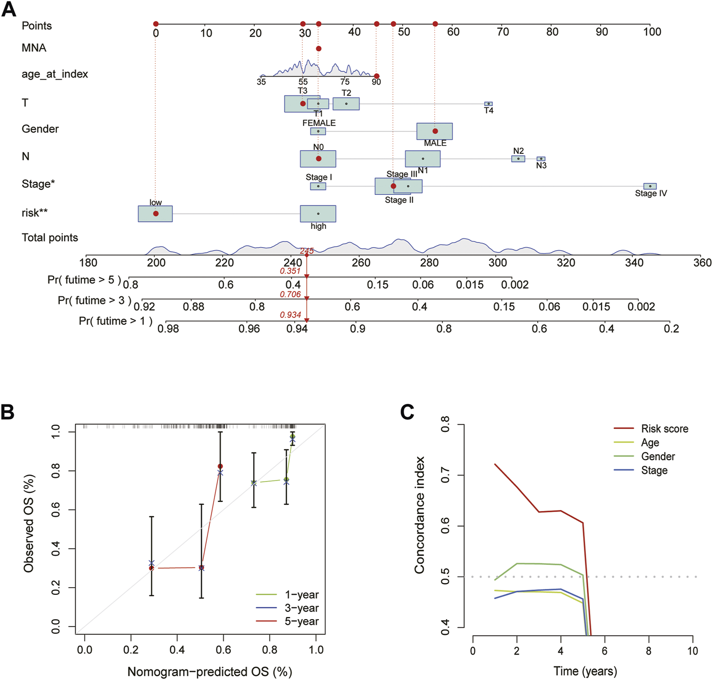 Construction and validation of the nomogram. (A) Nomogram predicts the prognosis of patients with ESCA for 1, 3 and 5 years. (B) The accuracy of Calibration curves verification results. (C) The C-index curve of the risk mode.
