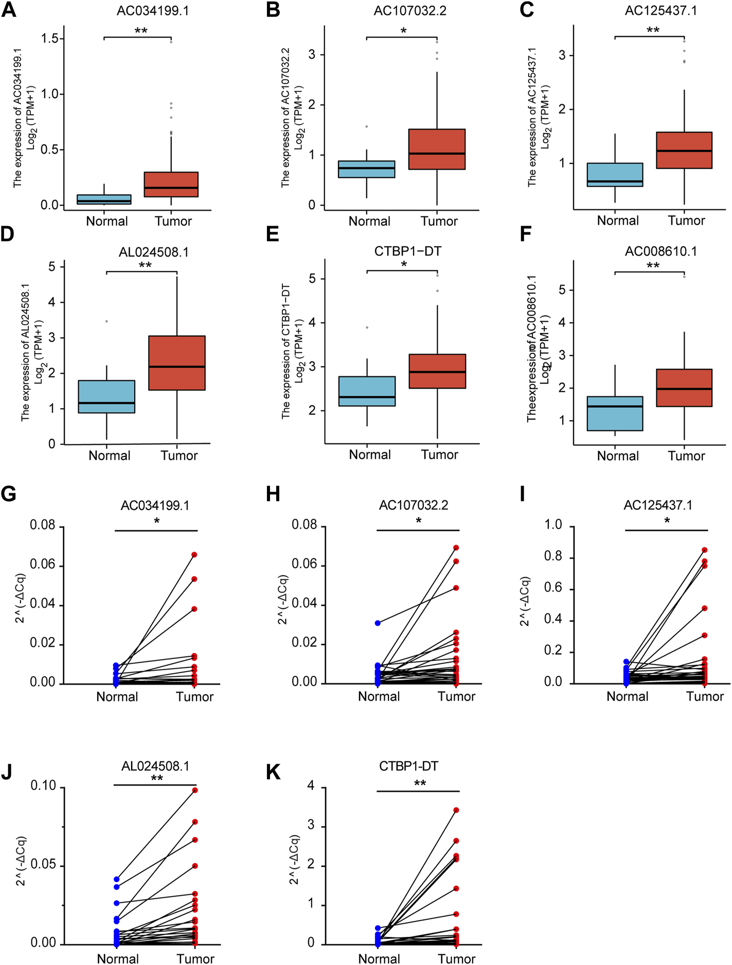 Expression of lncRNAs in TCGA and 40 paired ESCA tissues. The expression of AC034199.1 (A), AC107032.2 (B), AC125437.1 (C), AL024508.1 (D), CTBP1-DT (E) and AC008610.1 (F) in TCGA. qRT-PCR validation of expression of AC034199.1 (G), AC107032.2 (H), AC125437.1 (I), AL024508.1 (J), and CTBP1-DT (K) in 40 paired ESCA tissues.